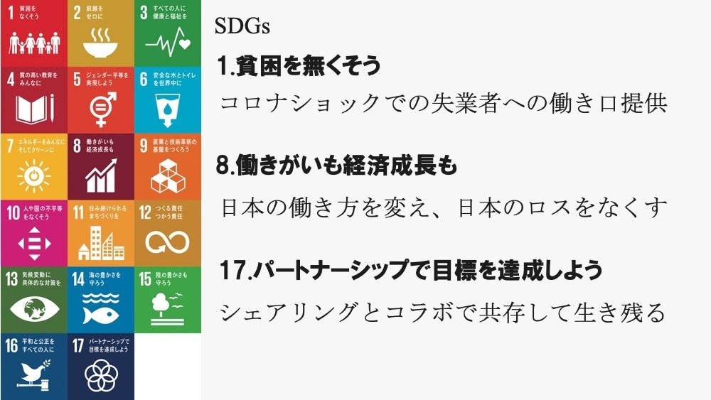 シェアすることで、「ロス」をなくすことができるのです。これはオフラインでは叶わないことでしたが、リモートやキャッシュレスが進むことによって選択肢が一気に増えました。今まで削減できなかったロスが、削減できるようになったのです。