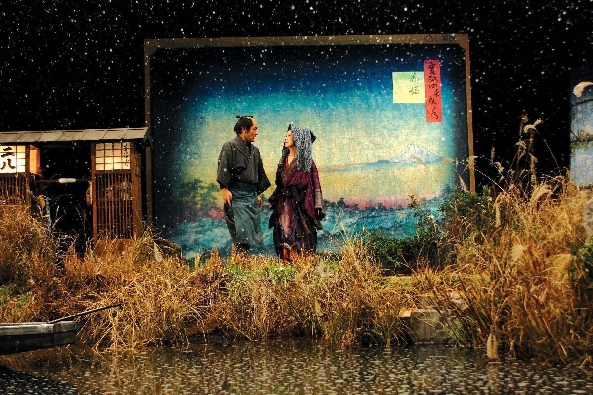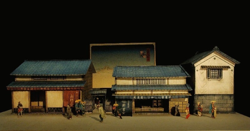 立版古(たてばんこ)とは、現代でいうペーパークラフトやジオラマ。名所旧跡や歌舞伎の名場面などを題材にした玩具です。本作では、舞台となる建物がそれぞれ立版古で表現されます。紙人形を持った手と並ぶサイズのこともあれば、演じる俳優自体がその中にいる実寸大になることもあります。