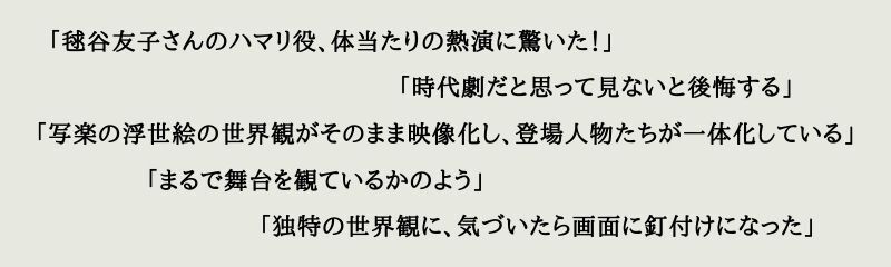 それは、日本文化をこよなく愛し、日本で一番歌舞伎を愛する映画監督を自認する、山﨑の当初からの誓いでした。リスペクトする伝統文化の様式美を用いて、ブレない美意識でこれをエンターテインメントと融合させ、これまでに見たことのない新感覚の時代劇に仕上げたのです。