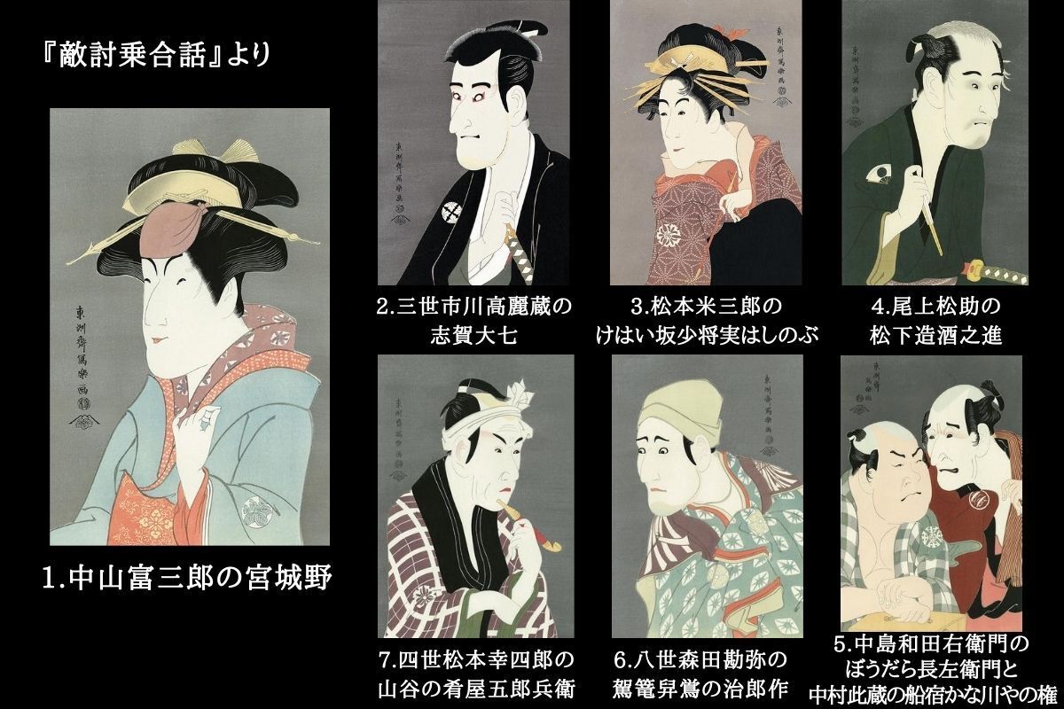 寛政6(1794)年5月、桐座で上演された『敵討乗合話(かたきうちのりやいばなし)』より描かれた7点の大首絵は、写楽の初期代表作といわれています。