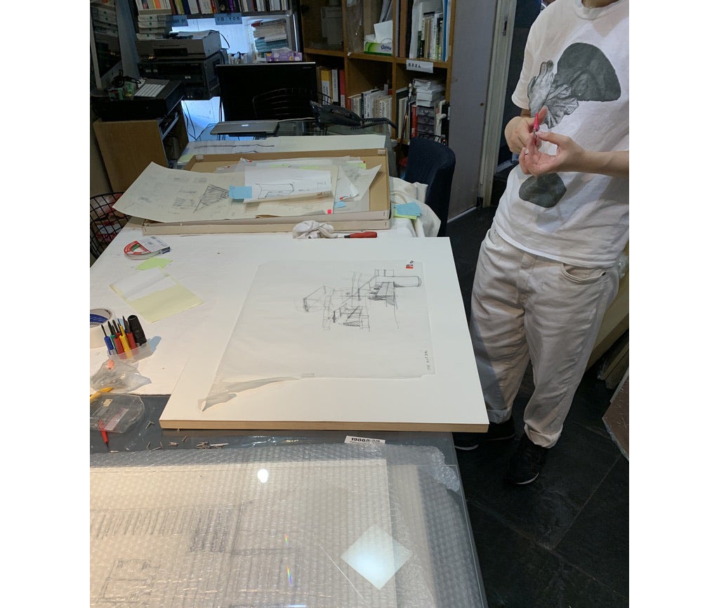 作りしながら、パフォーマンスの進行など。事務所では初めて展示する、マリオ・ボッタの鉛筆ドローイングの額入れに追われている杉山さんが奮闘している。私と姉は、このクラウドファンドでアート作品のリターンがなくなってしまい、多くの方から追加はないのでしょうかという問い合わせにお答えして追加のリターンアート作品の吟味を行なっております。(姉が額入れのサポートへ)私はみんなのお弁当買いに行きます。