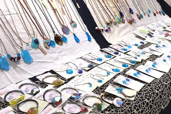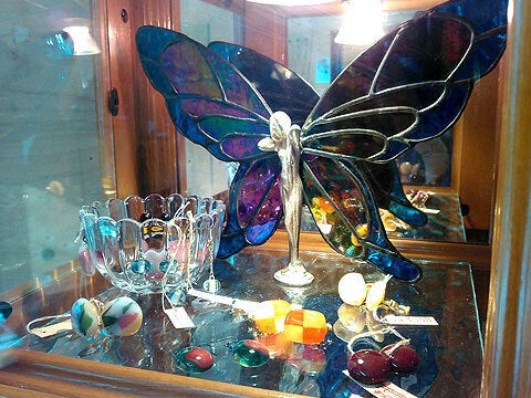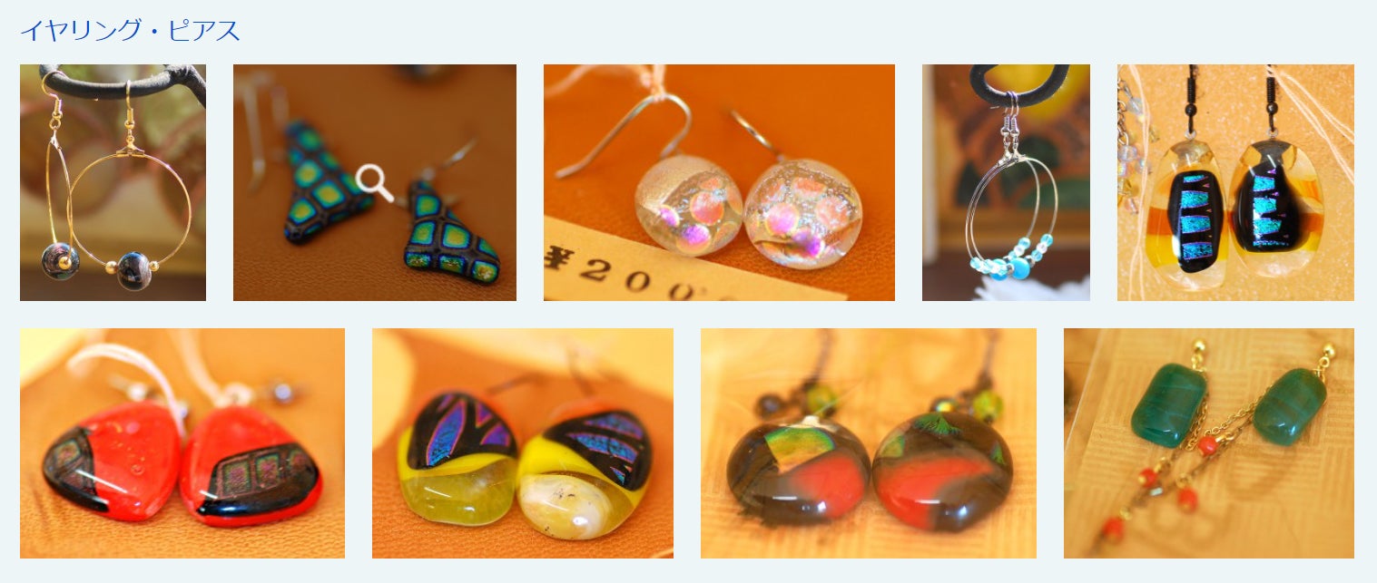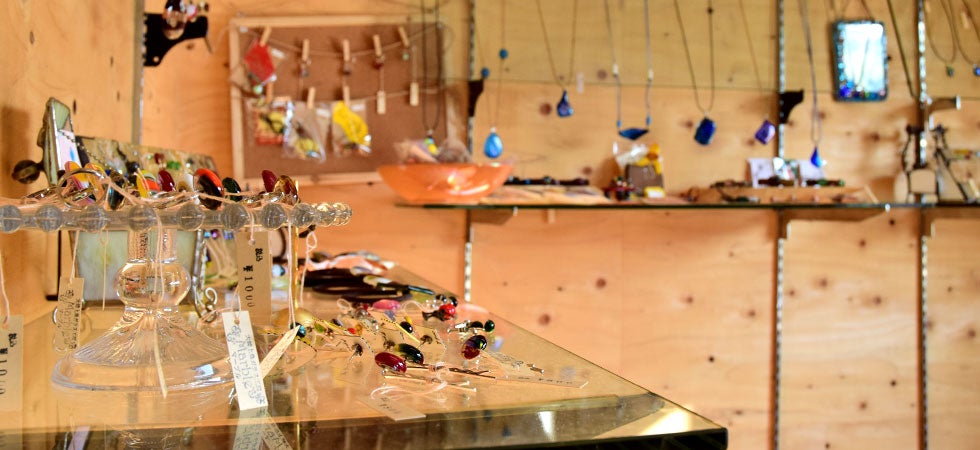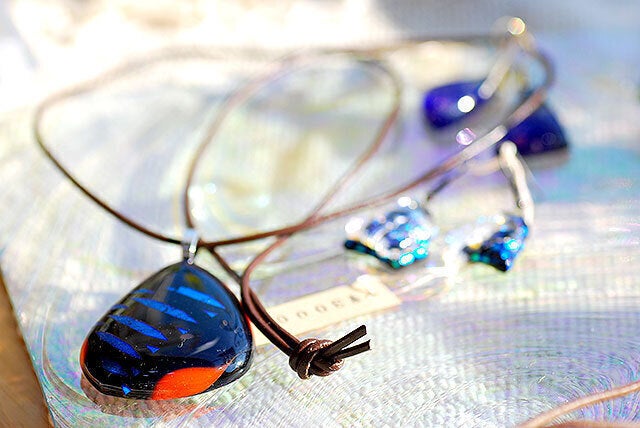 商品は全てオーナー自ら工房内で色ガラスを溶かし、1つづつバーナーや窯で焼き上げたオリジナル商品です。暗闇でもキラキラ光るダイクロガラス、独自の手法と斬新なデザインでつくりあげたとんぼ玉など、個性豊かなものばかり。