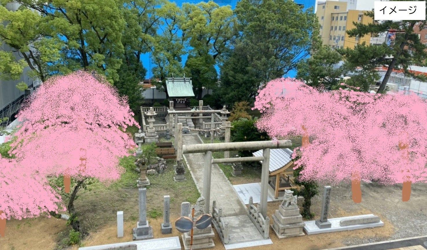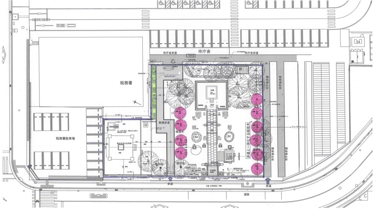 将来、こんなスポットになれたらと思い描いています。※図面イメージのピンク色を示した箇所に桜を植えて、神社と新しい市庁舎とつながる予定の舗道沿いに桜が咲いていたら素敵だなと想像しています。