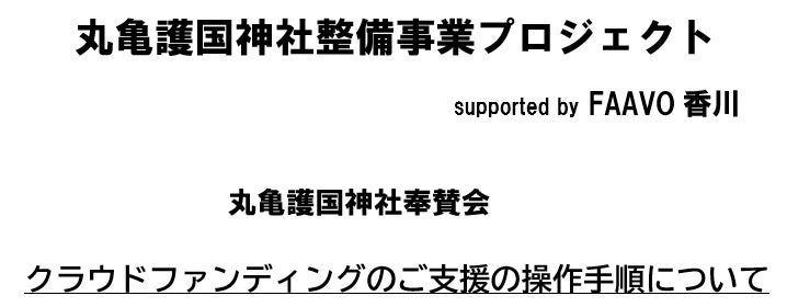 ◆クラウドファンディングのご支援の操作手順について本プロジェクトに これからご支援をして頂く方に向けて、ご支援の手順について以下の通りまとめましたので、ご参考くださいますよう、お願い申し上げます。インターネットから「FAAVO香川」とご検索頂き、そのホームページの中の「プロジェクト実績」の項目に、下図のような「丸亀護国神社-丸亀の歴史・文化遺産の再生を-」と題したプロジェクトが見つかると思います。◎なお、本プロジェクトにご支援頂ける募集期間は 2020年 12月 13日(日) までです。② まずは会員登録をしてからはじめます。※既に登録されている方は先にログインをしてからお手続きに進みます。下図を参考に「新規会員登録」をしてから、手続きに進んでください。メール、Facebook、Twitter、LINEアカウントの4種類の方法から登録できます。③メールアドレスをご入力後、メールアドレス宛に、クラウドファンディングの運営会社CAMPFIRE(キャンプファイヤー)から「本人確認のお知らせ」のメールが届きますので、メールを確認し、メールアドレスの認証をお願いします。上図を参考に、認証するボタンを入力後、「アカウント情報の登録」に移ります。任意のニックネーム(半角英数)とパスワードを登録頂ければ完了です。④当会のプロジェクトをご覧頂き、ご賛同を頂ければ、ご支援金額とリターン(お礼品)を選択して頂きます。金額の左にある□をクリックしてチェックを入れてください。支援する金額に伴い、プランが変わってきます。支援したい金額を考えてご選択してください。※複数のリターン(お礼品)をまとめてご支援することもできます。⑤「上乗せ支援で応援しよう」ボタンで、500円ずつ応援金額を上乗せすることもできます。※任意ですので、ご支援の際のご参考になさってください。⑥「お支払方法を選ぶ」ボタンをクリックする⑦下図のようなお名前やご住所などの必要情報を、ご入力して頂きます。⑧必要情報をご入力後、お支払い方法を選択します。クレジットカード、コンビニ、銀行振込、キャリア決済、PayPal、FamiPayの6種類のお支払い方法から選択し、手続きを行ってください。※別途にシステム料として220円(税込)がかかります。ご了承ください。お支払い方法をご選択し、必要情報をご入力頂きましたら、「完了ボタン」が表示されますので、支援内容をご確認の上、「完了」ボタンをクリックしてください。※完了ボタンを押さないと、手続きが完了しません。あとで、ご登録されたメールアドレスにCAMPFIREからご支援受付のお知らせが届きます。〈ご支援受付のお知らせが届いたらお手続きが 完了 となります。〉ご不明な点がございましたら下記の連絡先(できる限りメールを希望)までお問い合わせ下さい。丸亀護国神社奉賛会 marugamehousankai01@yahoo.co.jpTEL:(0877)88-8098 / FAX:(0877)24-1530 担当 水本