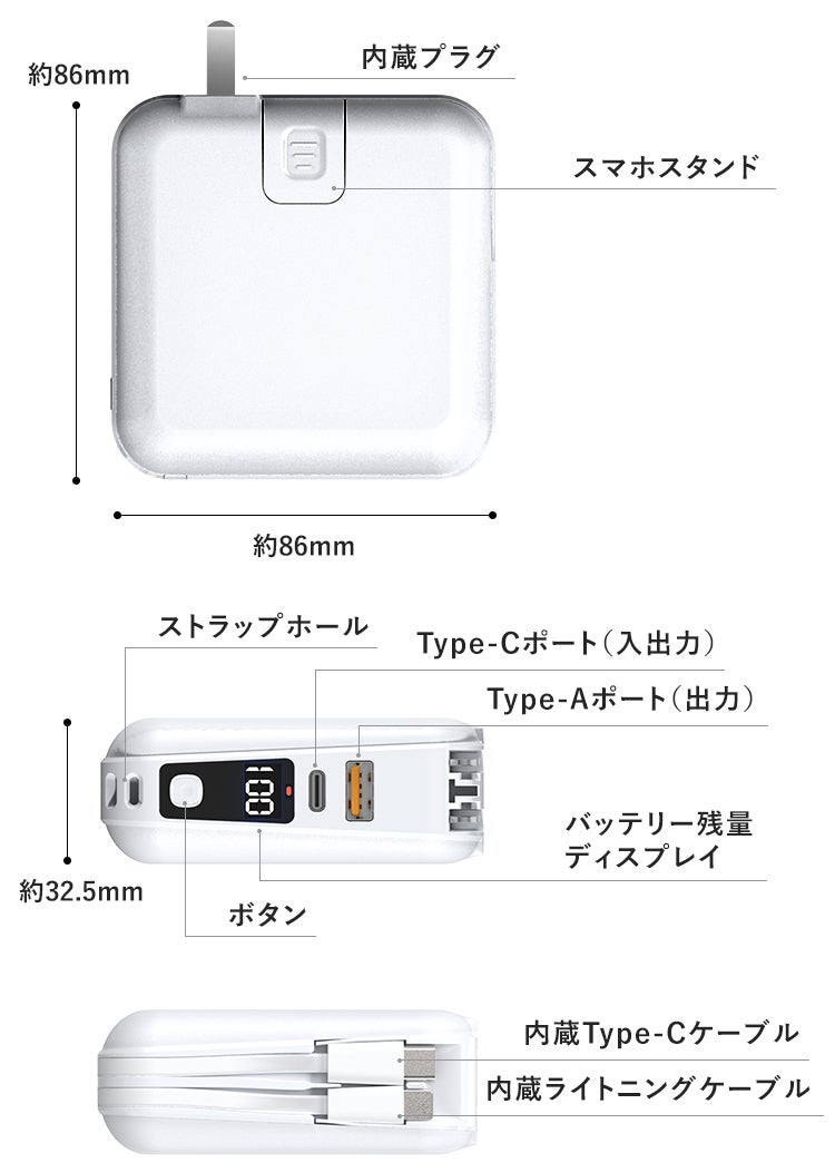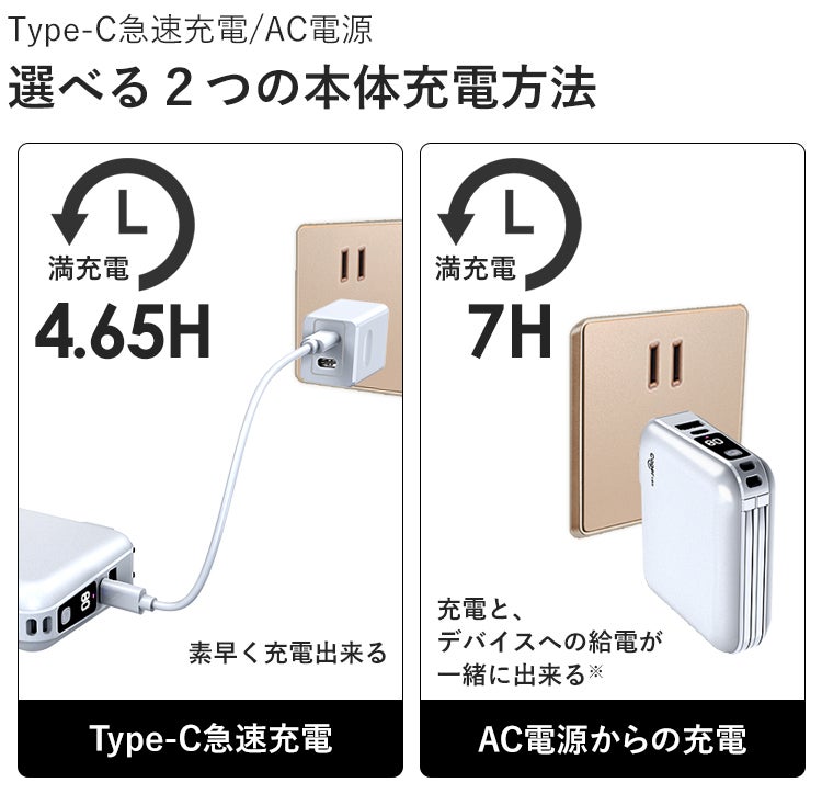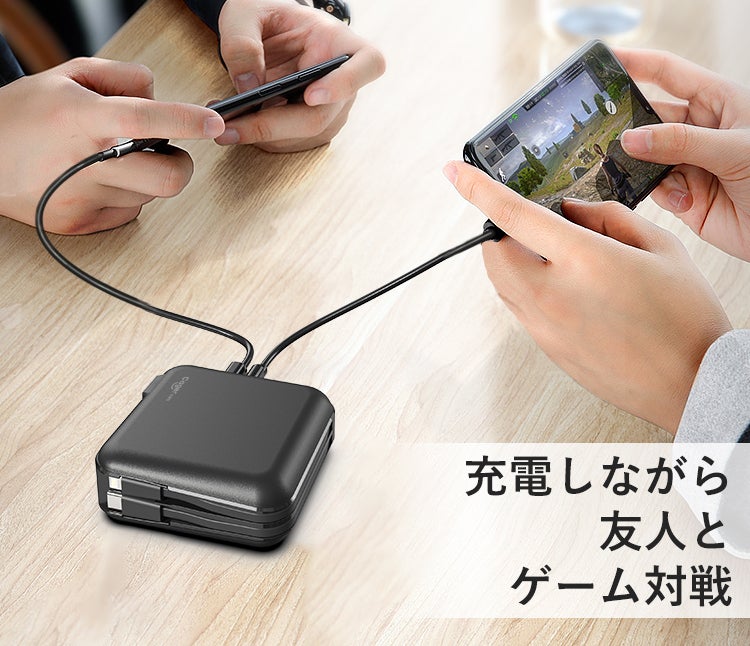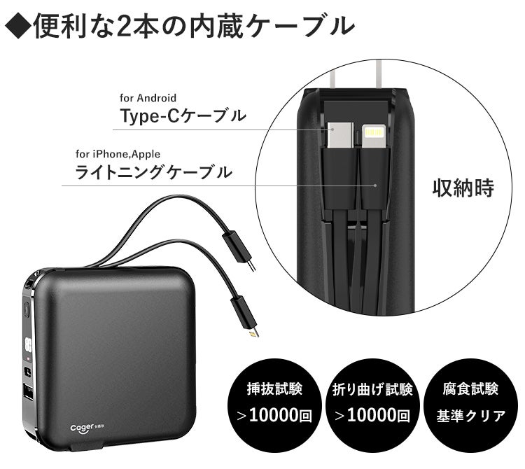 Androidスマートフォン、タブレットの充電に使用するType-Cケーブル、iPhone、iPadなどアップル製品の充電に使用するライトニングケーブルが各1本内蔵されています。複数台同時充電はしないという方なら、別途ケーブルを用意する必要が無く、これ1台持ち歩けばOK。各種耐久テストにクリアした丈夫なケーブルを採用していますので、安心して長くお使い頂けます。