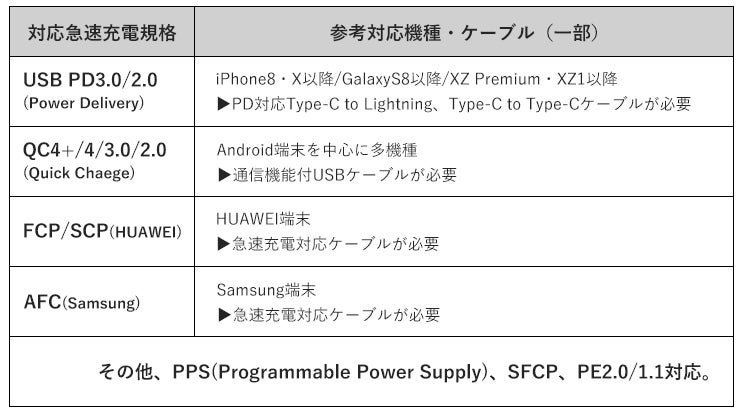 ▶PD3.0、QC3.0、他、各種急速充電対応