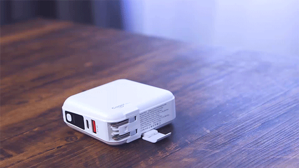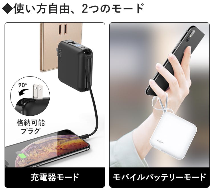 ●充電器モード…AC電源に接続して使用します。まず、デバイスへの給電が優先され、完了後は「PD15」内蔵バッテリーの充電に切り替わります。プラグは、折り畳んで格納出来るので、持ち運びの際邪魔になりません。