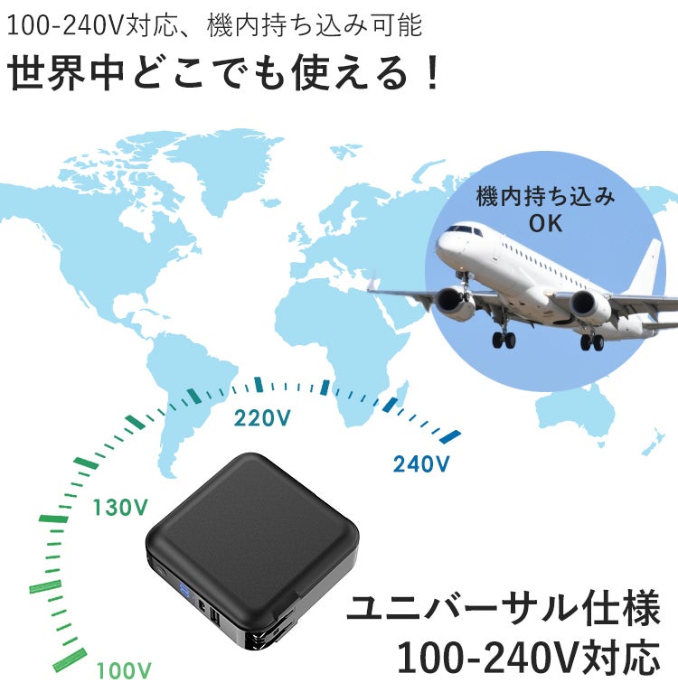 「PD15」は、100-240Vの電圧に対応するユニバーサル仕様です。世界中のあらゆる国で使用いただけるので、旅行・ビジネスでも大活躍!もちろん、機内持ち込みも可能です。