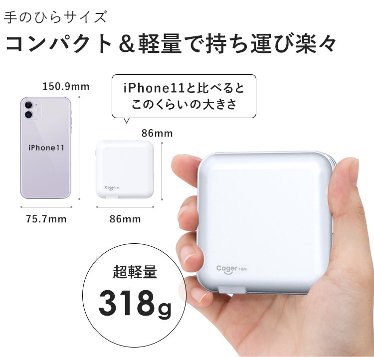 コンパクト&軽量設計も「PD15」の魅力。86x86mmの正方形で、手の中に収まるサイズ感。318gと超軽量で、持ち運びが苦になりません。