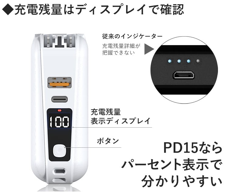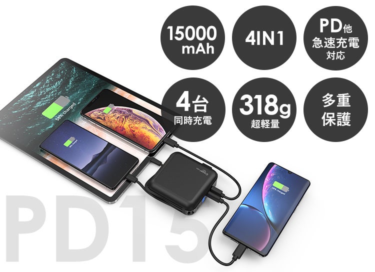 ※まず、デバイスへの給電が優先され、完了後「PD15」内蔵バッテリーの充電に切り替わります。