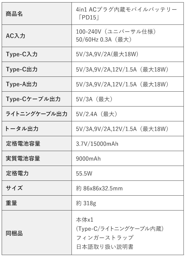 ACプラグ内蔵モバイルバッテリーは、通常のモバイルバッテリーと比べ、バッテリー容量が小さいという問題が有りました。有名メーカー製品でも、5000mAh~10000mAhが一般的。けれど、モバイルバッテリーとして使うのであれば、それに負けない容量が欲しいところ。「PD15」は、改良を繰り返し、なんと15000mAhの超大容量を実現しました!