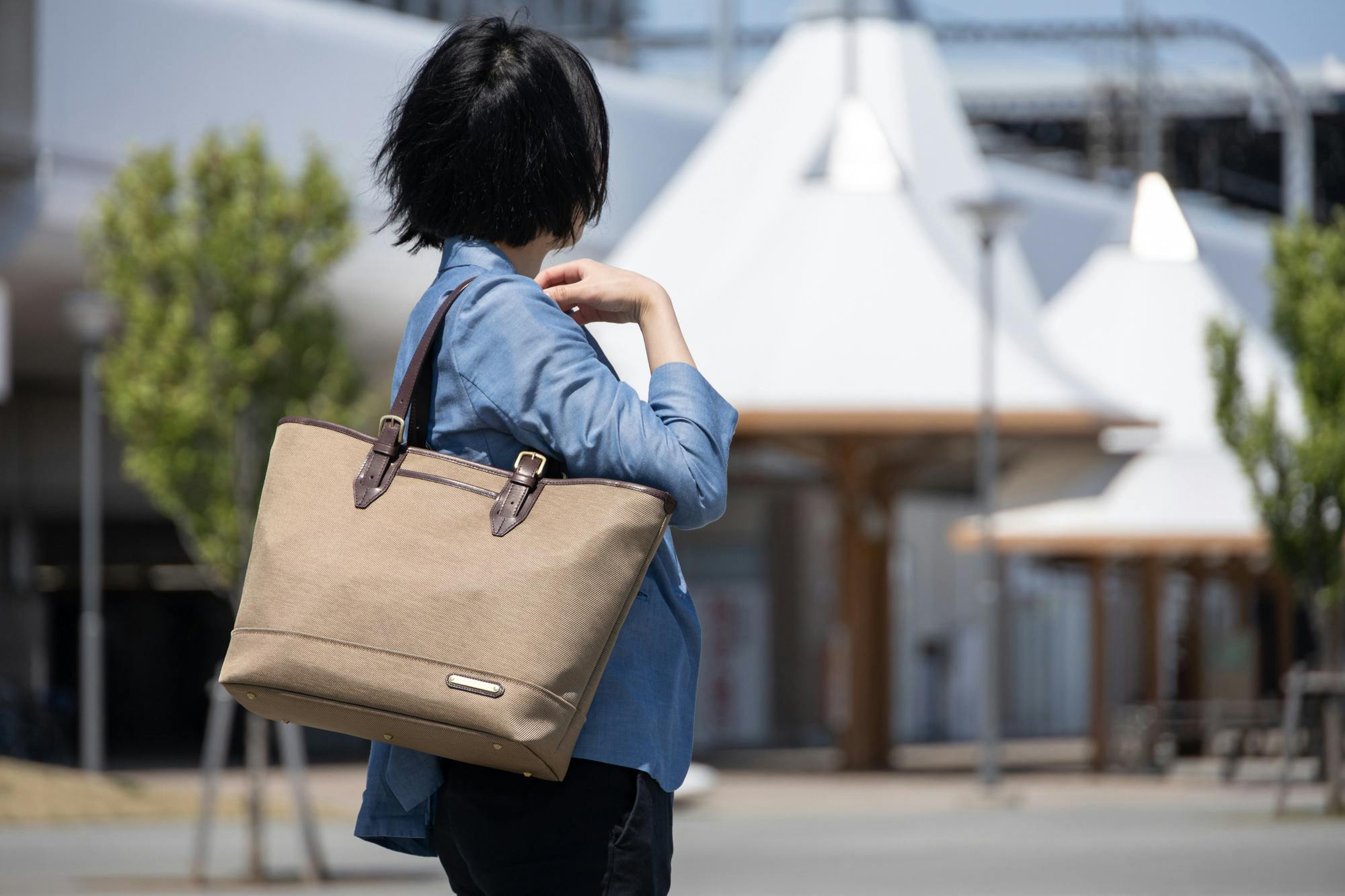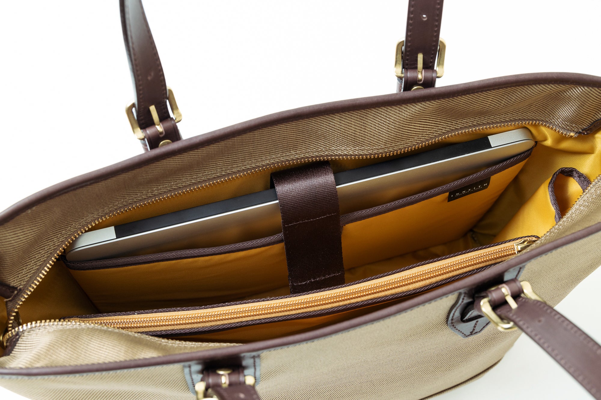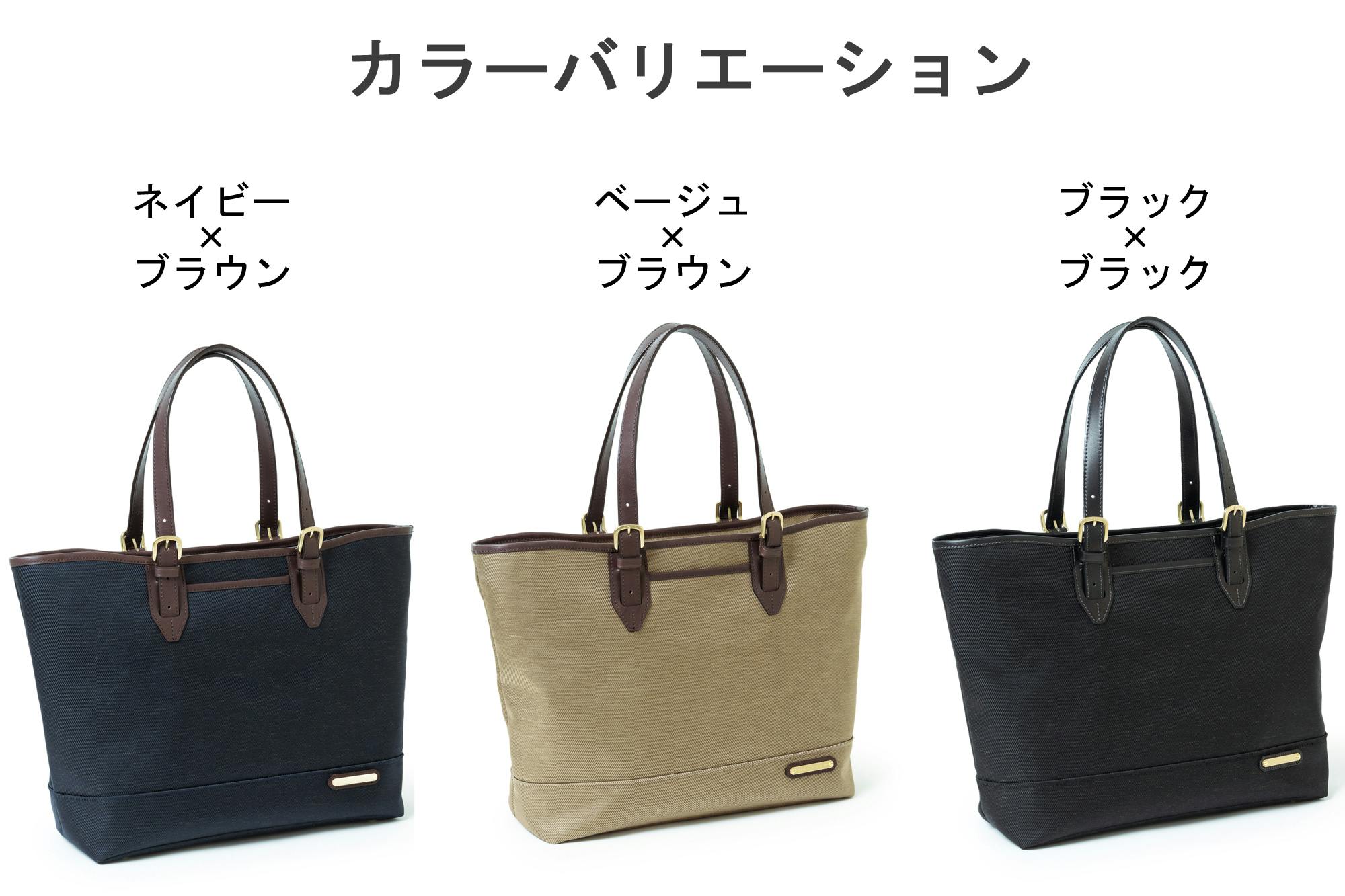トートバッグの口元に緩やかなカーブを付けることにより、上品な印象を出しています。