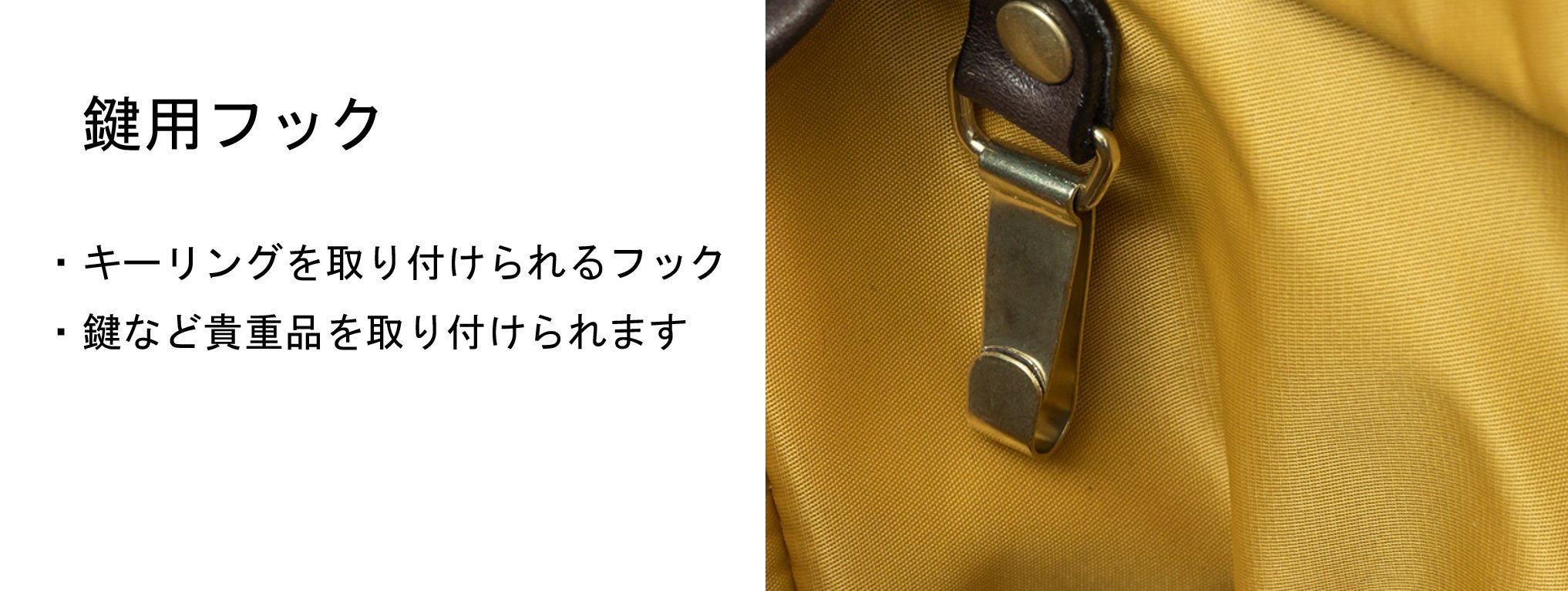 このトートバッグは肩紐の剣先が収納式となっているので、長さを調節しても余りが邪魔になったり見た目が変わる事がありません。剣先収納箇所はアクセントでストライプにしてみました。使う人にしか分からない遊び心です。