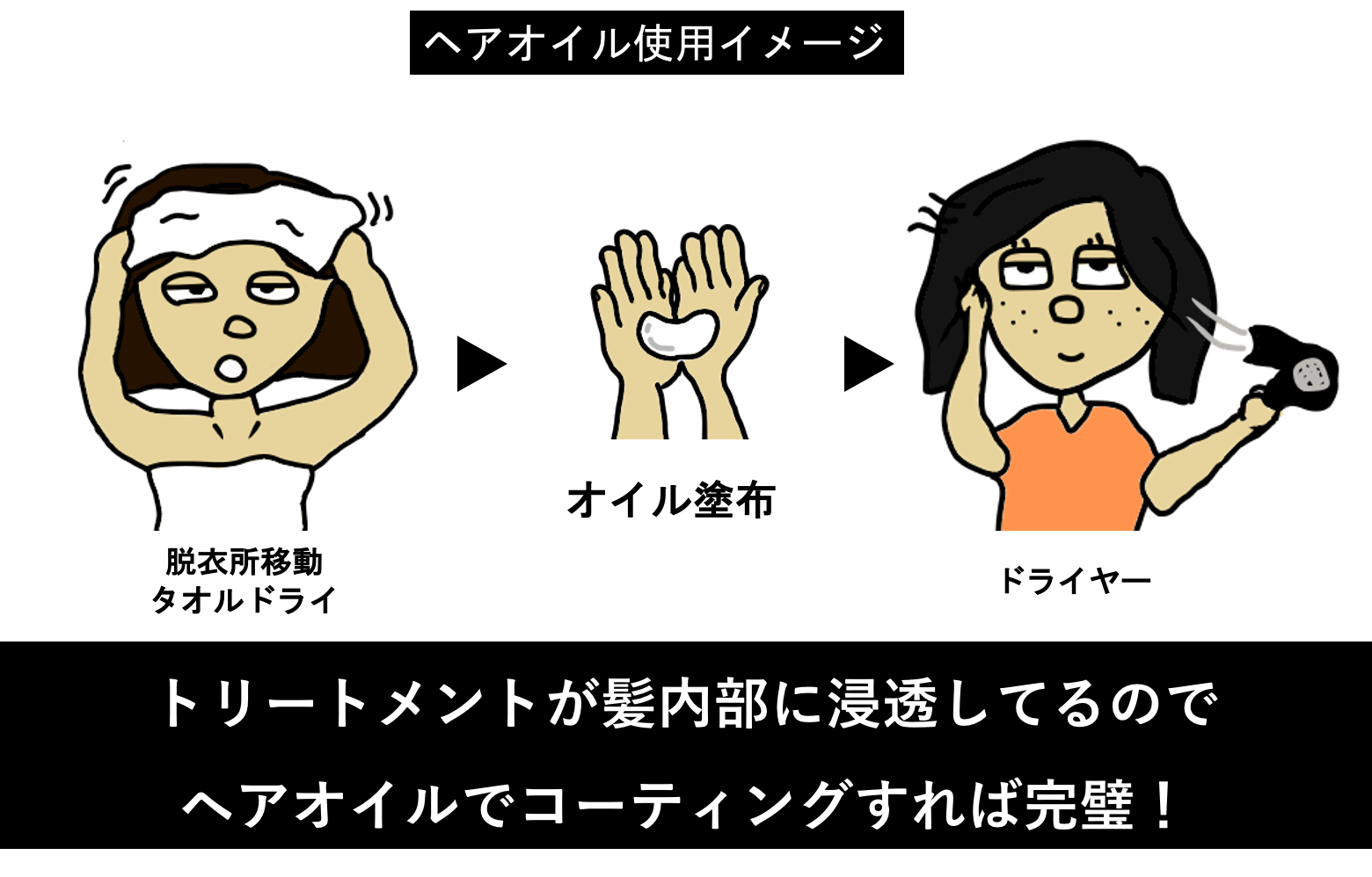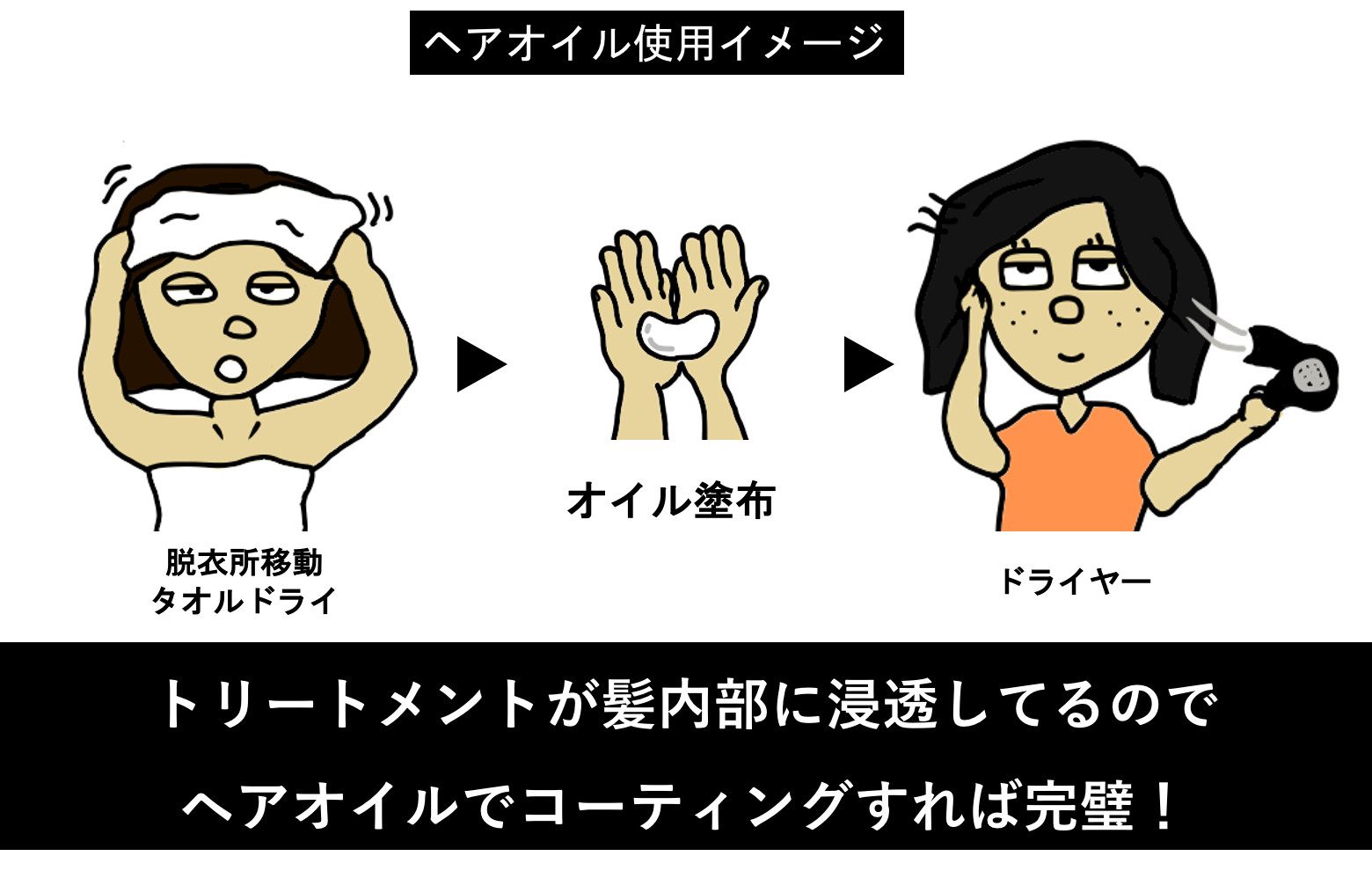 温冷交互浴後に脱衣所へ移動したら、ヘアオイルを塗布し必ず髪を乾かそう!半乾き状態が毛髪の傷みを促進させる最大の原因です。