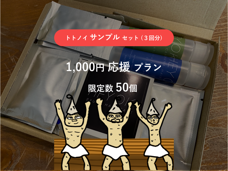 トリートメント&ヘアオイのサンプル3回分をお届けします!主に活動支援いただける方向けのリターンで、サウナ入らないけど友人や同僚にサンプルをプレゼントする方には最適なリターンです。