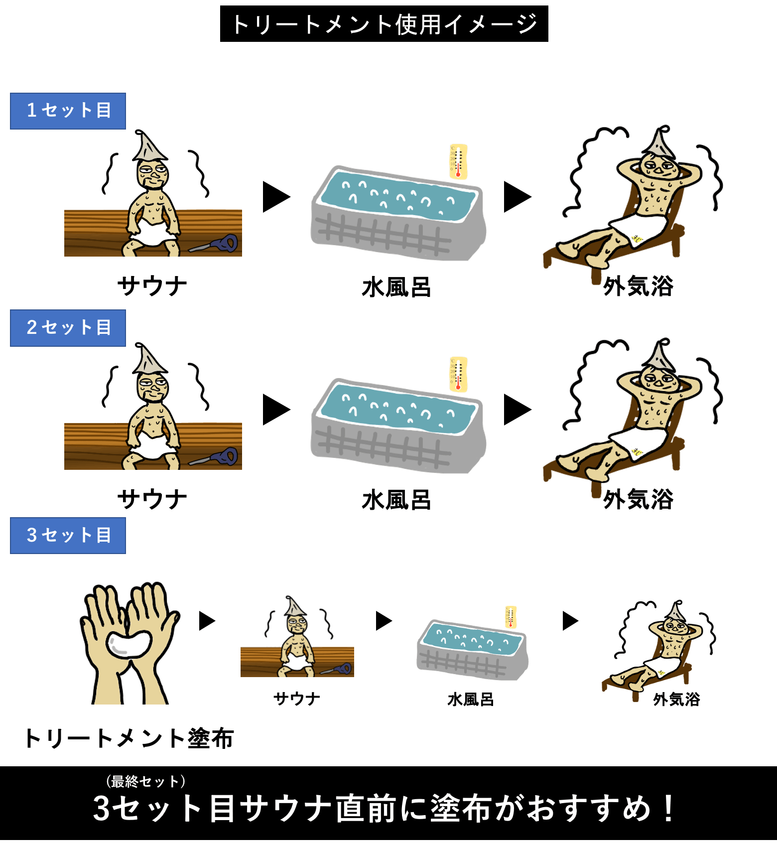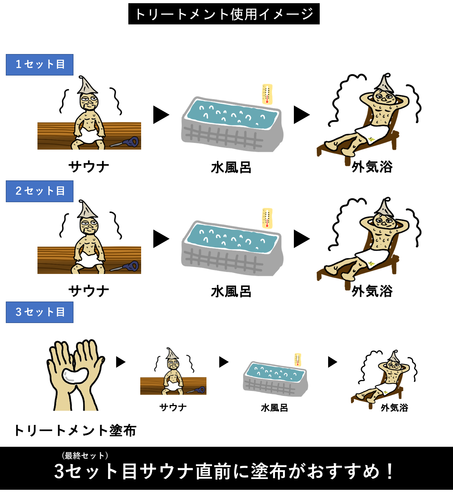 ・サウナ浴を繰り返しキューティクルを開かせてトリートメント浸透率をあげる