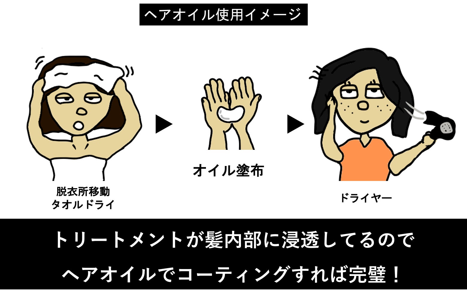 温冷交互浴後に脱衣所へ移動したら、ヘアオイルを塗布し必ず髪を乾かそう!半乾き状態が毛髪の傷みを促進させる最大の原因です。