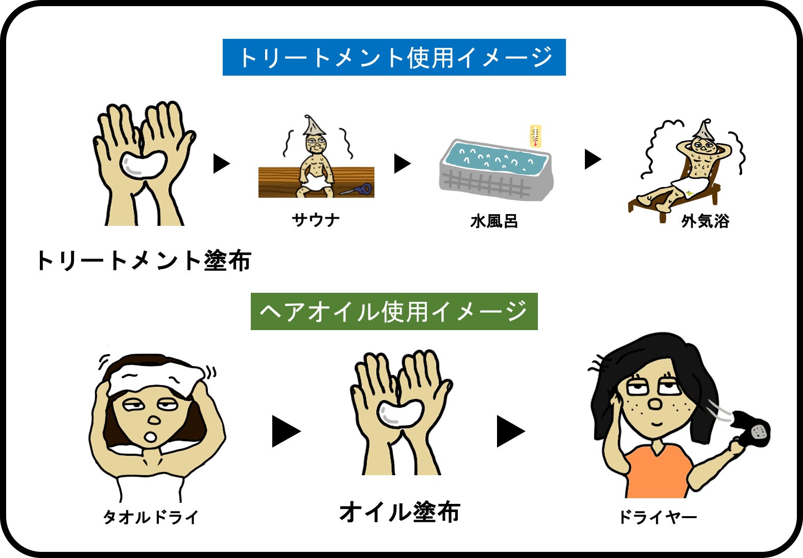 今回お届けする商品は、サウナで傷んだ髪に栄養や水分を補給する「トリートメント」に加え、今以上に傷みが進まないよう髪を保護する「洗い流さないヘアオイル」です。