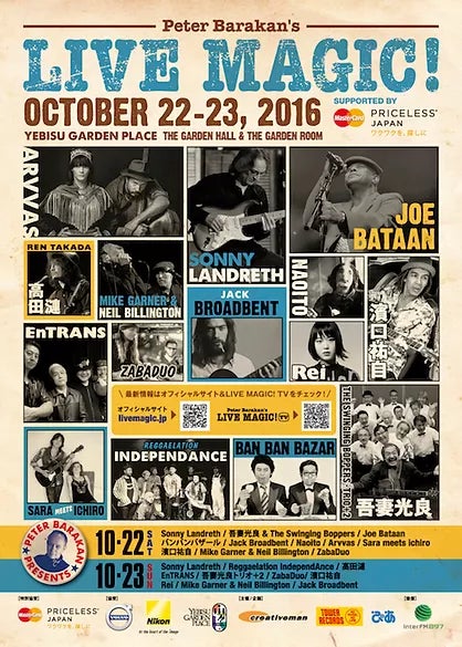 Sonny Landreth / 吾妻光良 & The Swinging Boppers / Joe Bataan / バンバンバザール / Jack Broadbent / Naoito / Arvvas / Sara meets ichiro / 濱口祐自 / Mike Garner & Neil Billington / ZabaDuo