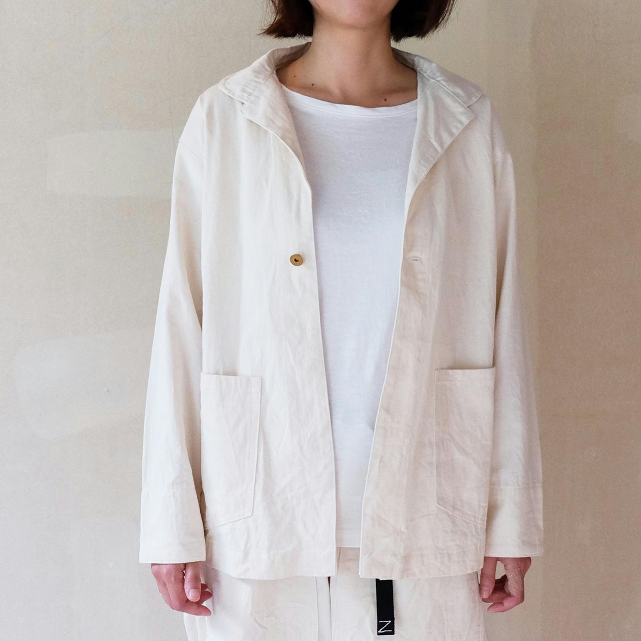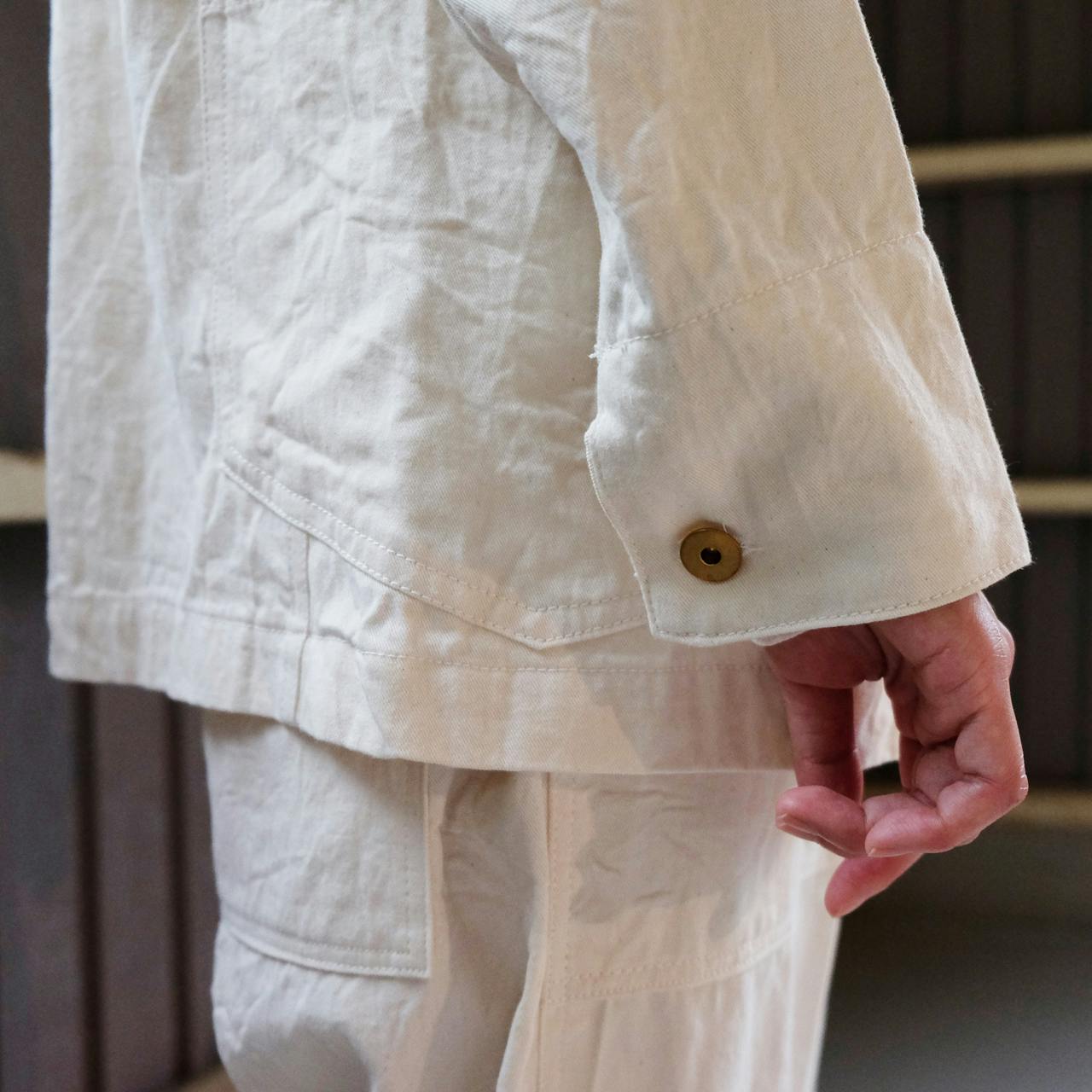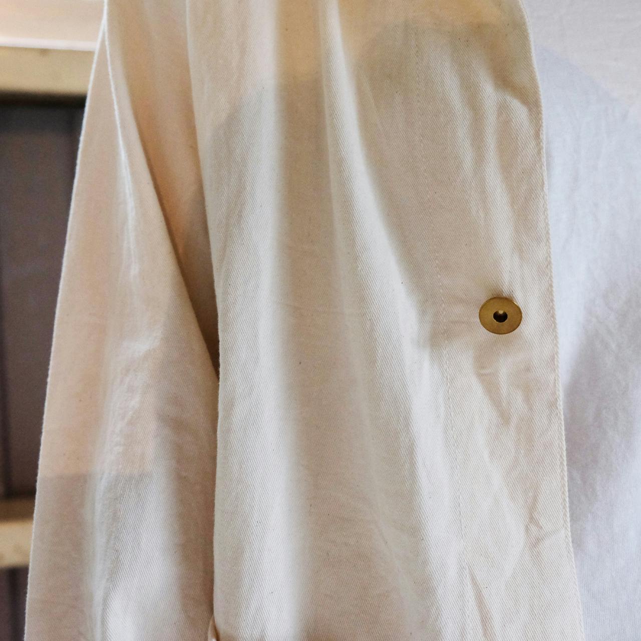 真鍮のドーナツボタンをワンポイントに生成りのカツラギ(綿100%)を使用し、