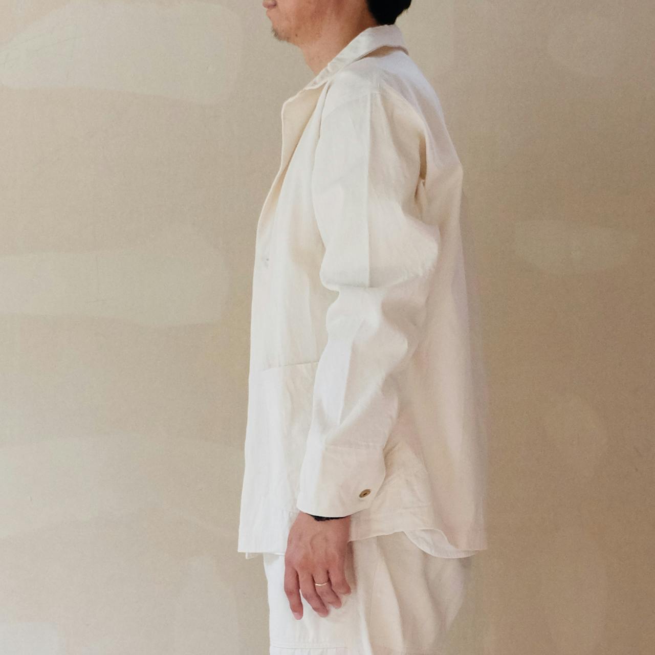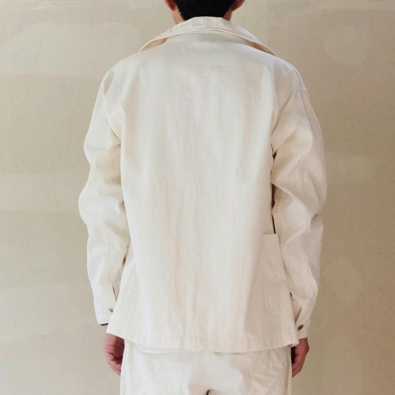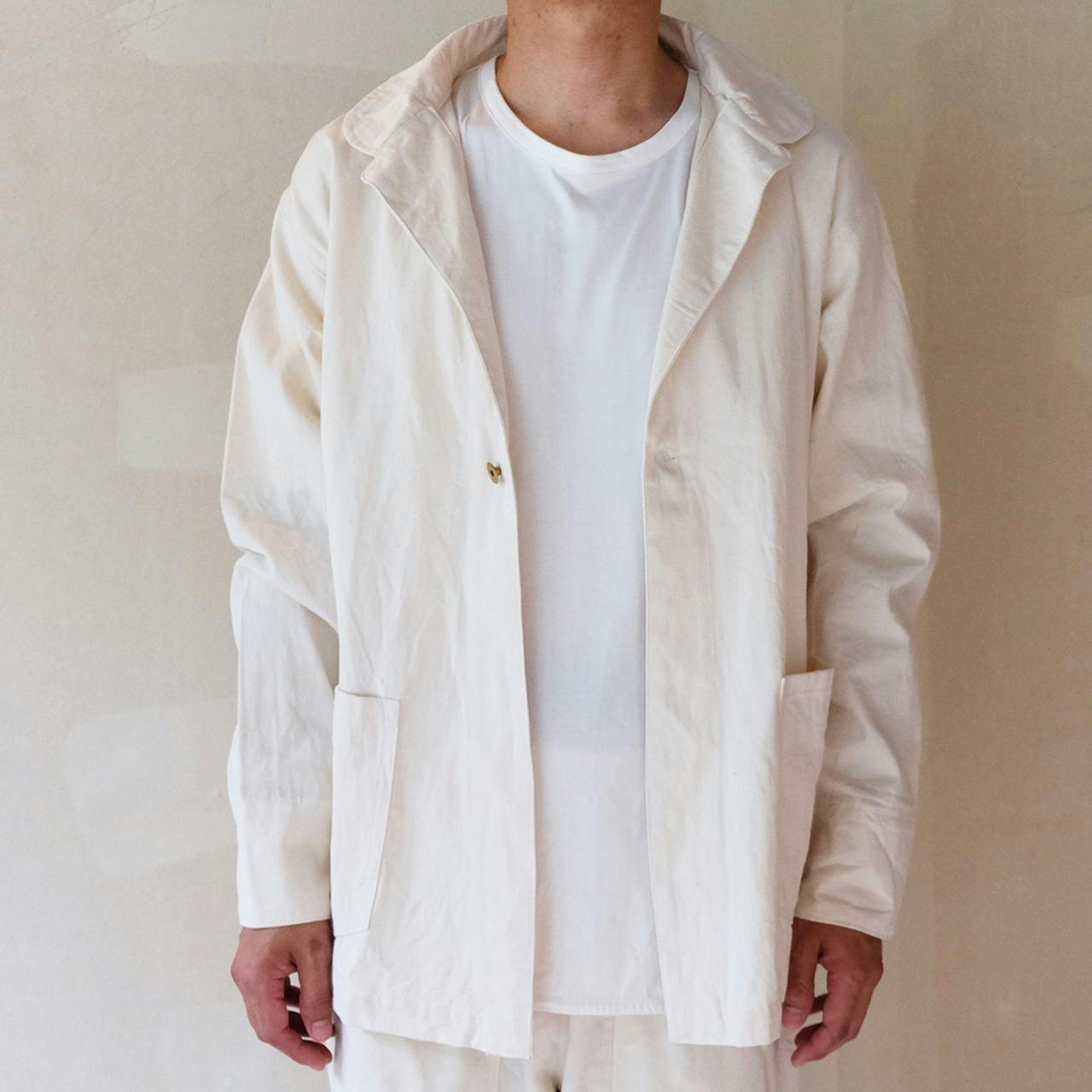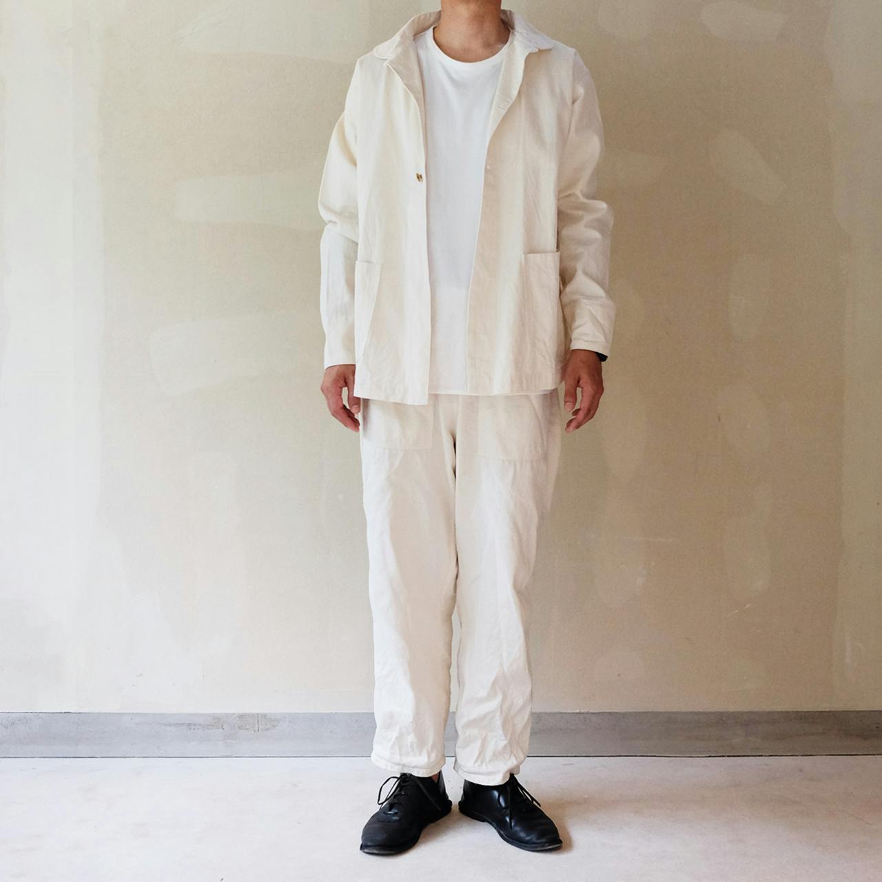 真鍮のドーナツボタンをワンポイントに生成りのカツラギ(綿100%)を使用し、