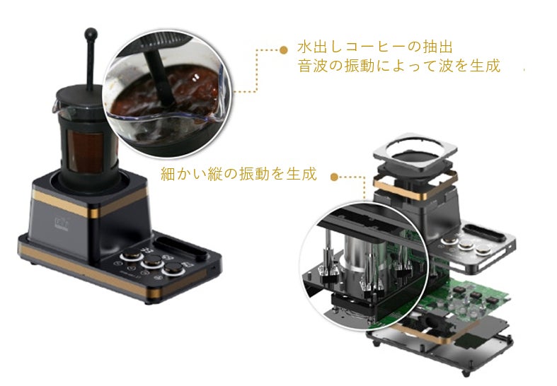 スピーカーの音波を活用した新技術を利用し、精密な垂直振動で発生する波動により、素早く、簡単に、安全に水出しコーヒーの抽出が可能です。