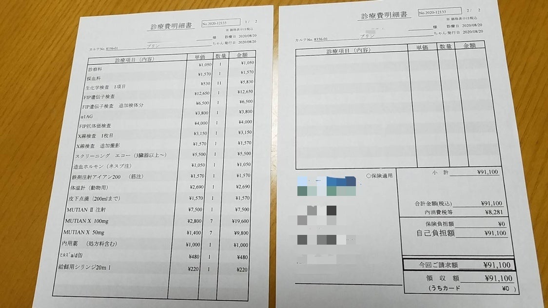 8月20日よりMUTIANの治療を行う病院で治療を始めました。FIPはウェットタイプとドライタイプの2種類がありますが、より詳しい検査でプリンちゃんは2種類の症状が出ているため、治療の初期から薬の量が多い混合タイプの中期でした。