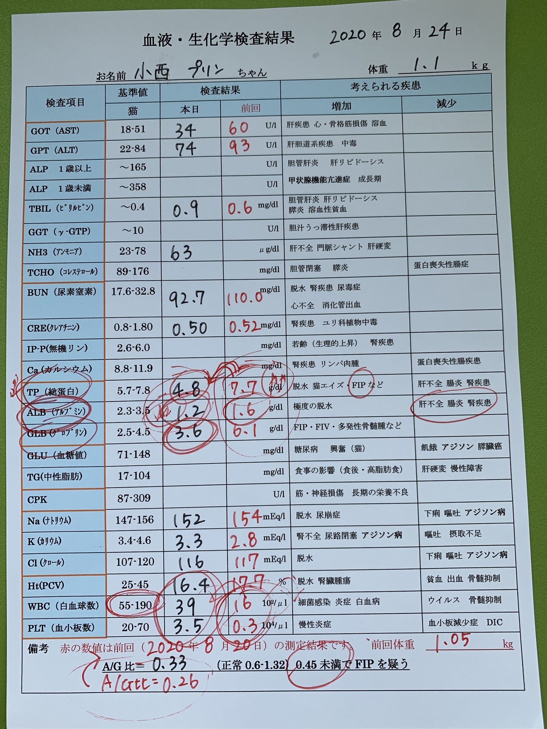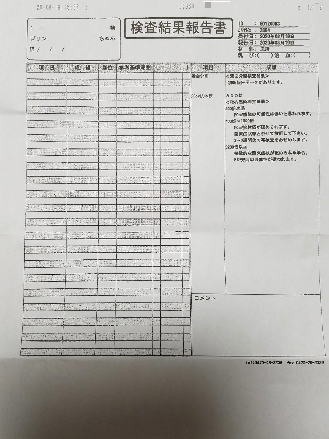 8月19日 検査結果でFIPを判明した