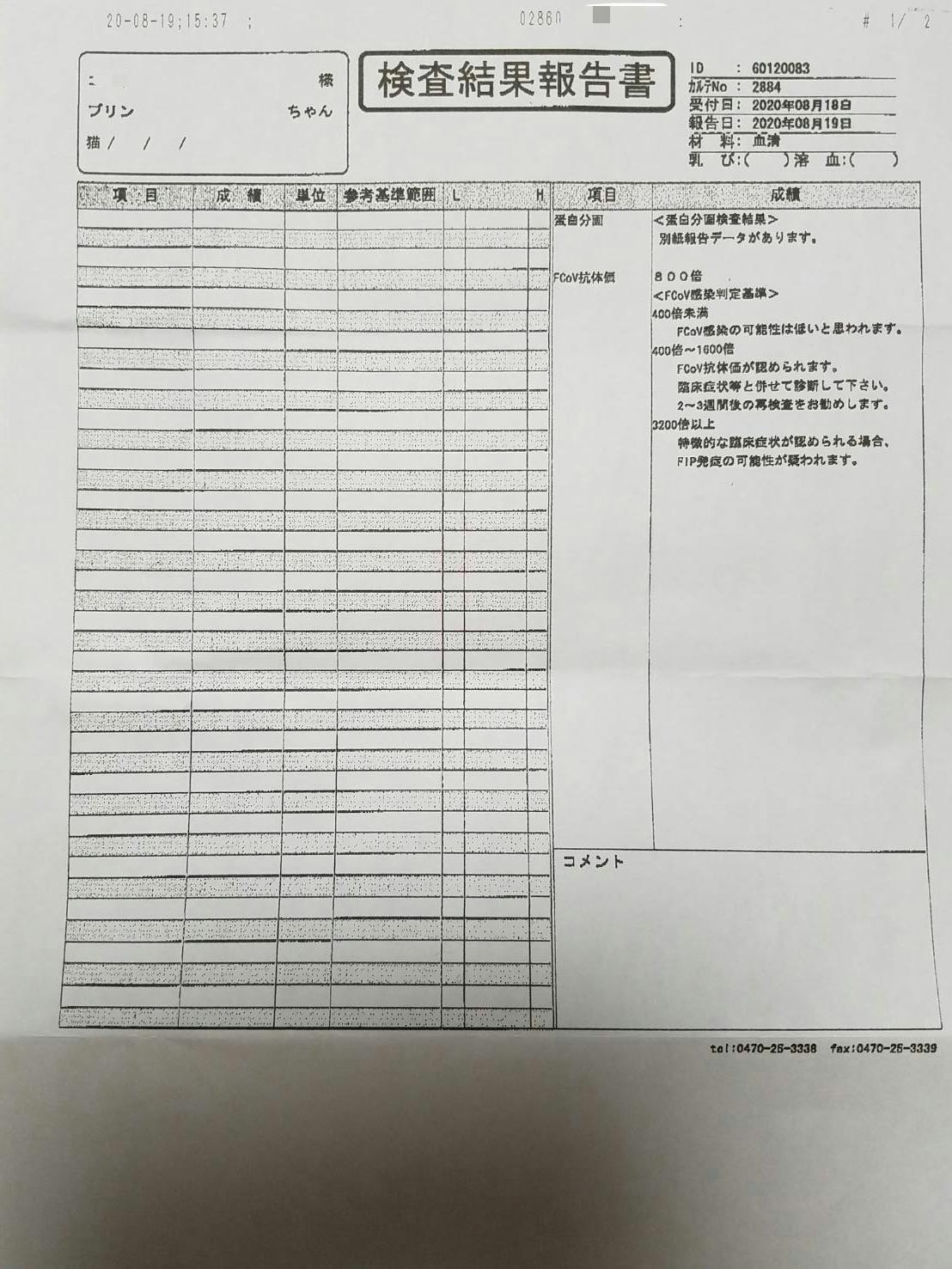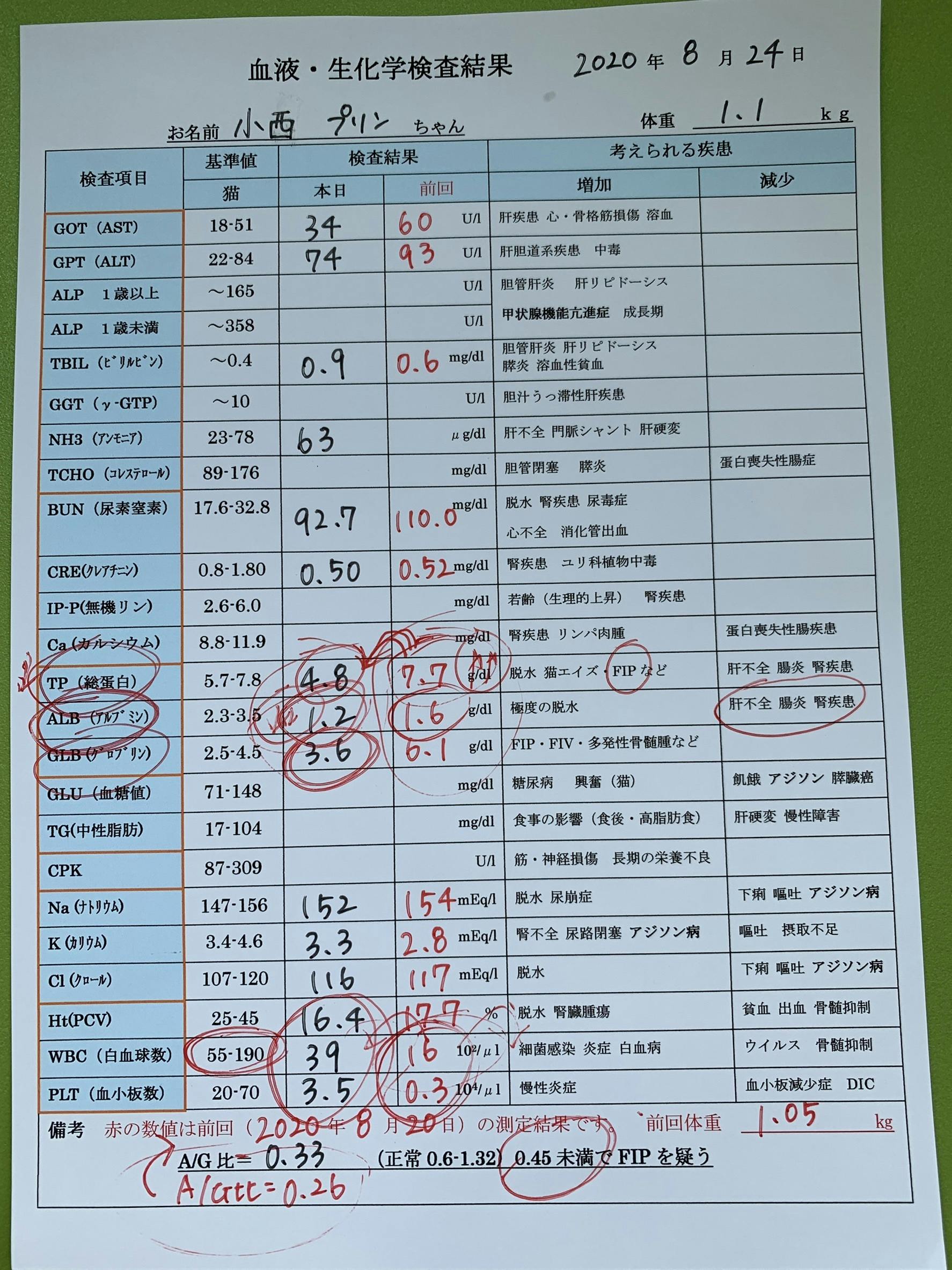 今回、プリンちゃんを病院に連れて行くきっかけになったのは、食欲不振と黄疸の症状があったためです。体を調べるためのエコーで、腹水を発見することができました。血液検査では白血球数が異常に増えており、炎症マーカーが強く出ていることが判明しました。蛋白分画、Fcov抗体検査でも、FIP陽性という結果でした。