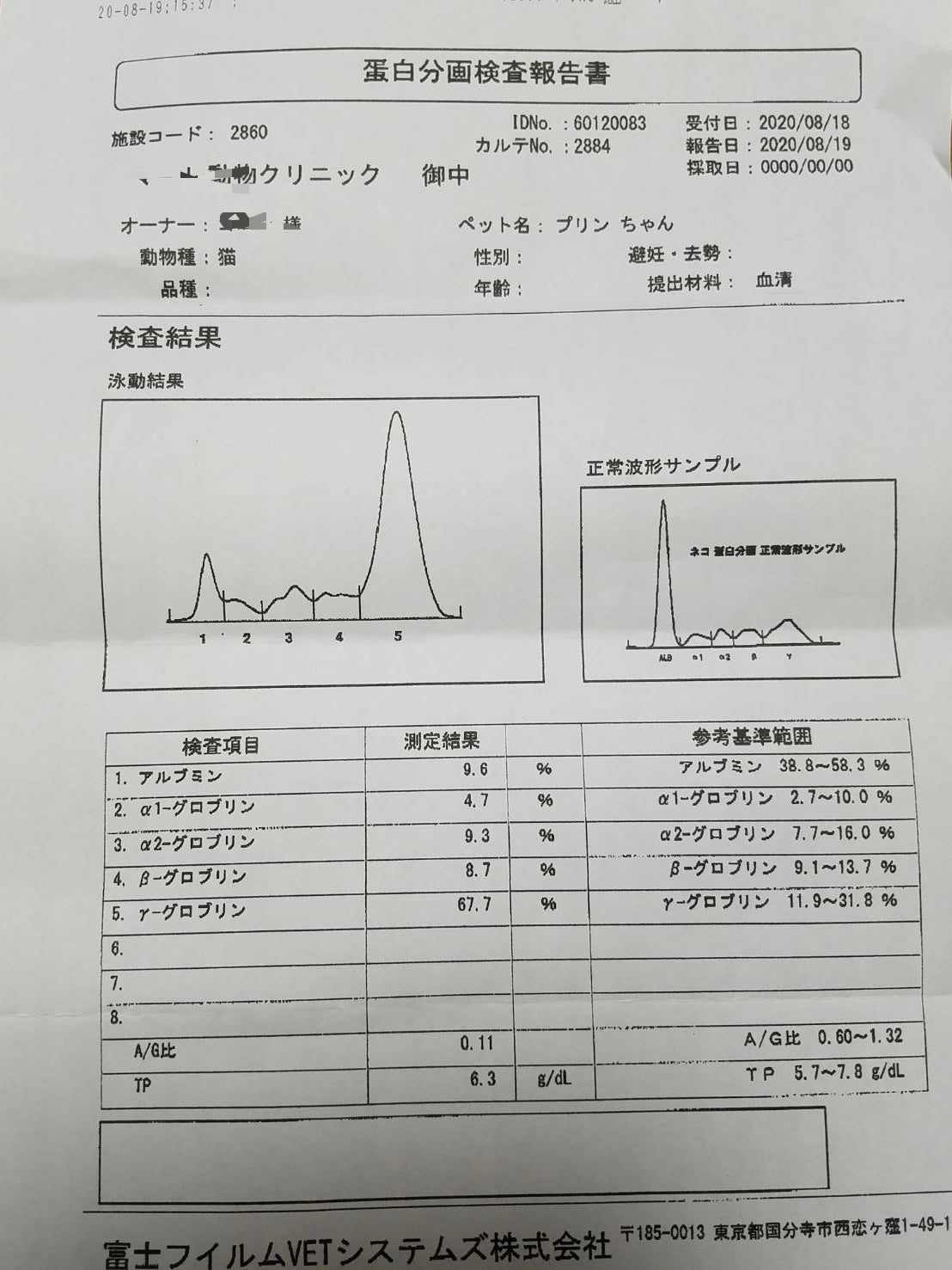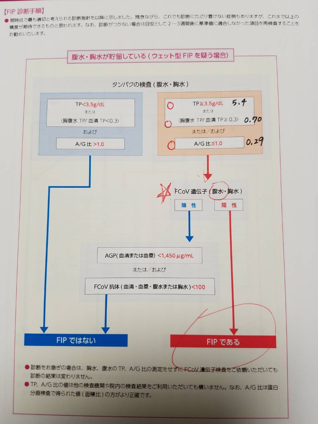 今回、プリンちゃんを病院に連れて行くきっかけになったのは、食欲不振と黄疸の症状があったためです。体を調べるためのエコーで、腹水を発見することができました。血液検査では白血球数が異常に増えており、炎症マーカーが強く出ていることが判明しました。蛋白分画、Fcov抗体検査でも、FIP陽性という結果でした。