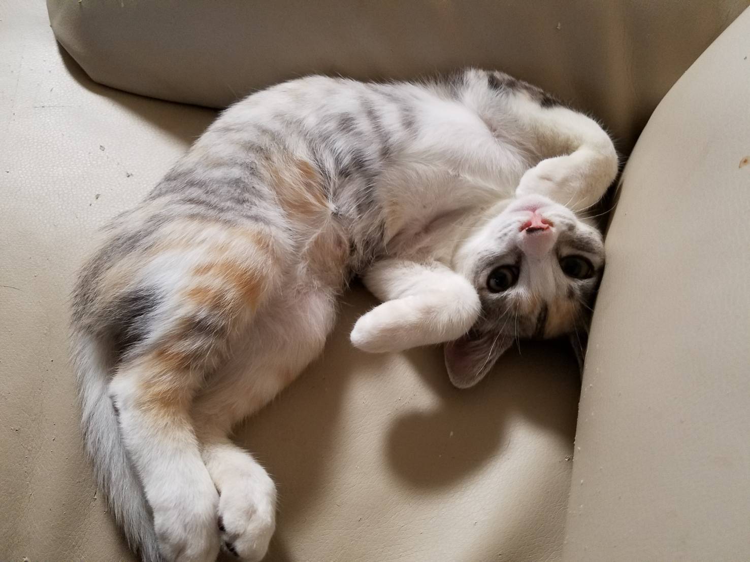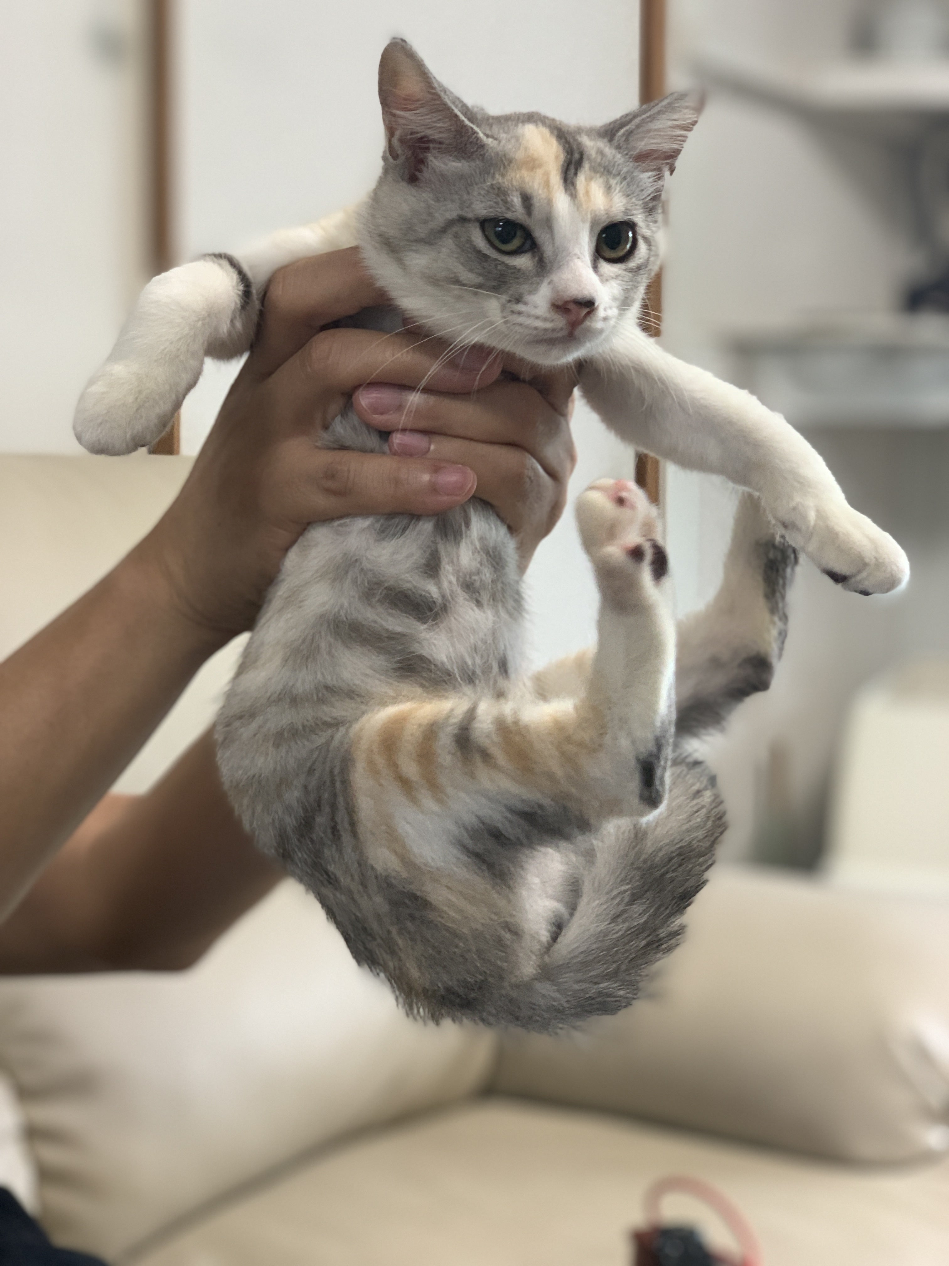 プリンちゃんとの出会いは南房総のある漁港でたくさんの子猫が生まれて、その中で一番小さかった子猫でした。保護した当時400gしかなかったプリンちゃんは人見知りでいつもお家の隅っこに隠れていました。一ヶ月程経った頃ようやく環境に慣れてきて、抱っこすると甘えるように膝の上でフミフミするような可愛い子でした。