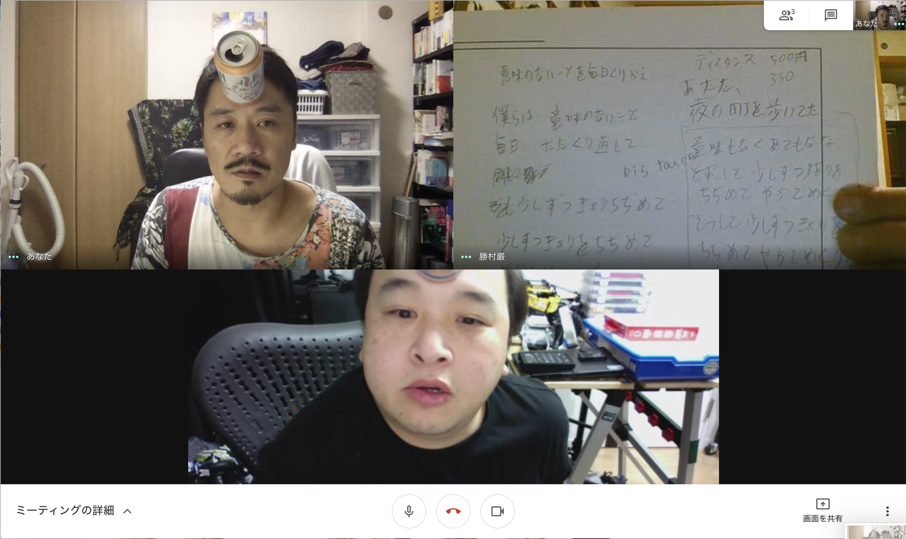 この企画を手伝ってくれてる勝村巌さん(画面右上)と江口拓人さん(画面下)の3人で今後の展開を話しているときでした。
