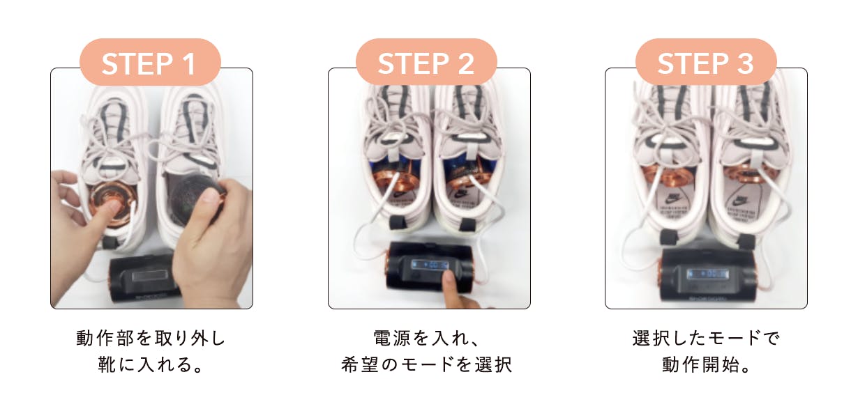 動作部を靴に入れてモード選択し、開始ボタンを押すだけ!