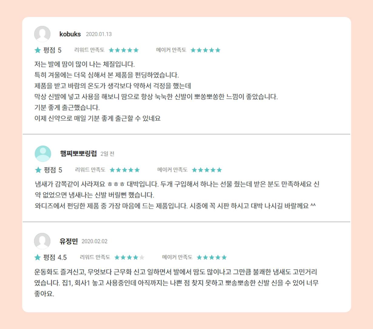 “ 勤務中にかく足の汗による不快感と臭いが悩みの種でした。家用に1つ、会社用に1つ置いて使用中です。今のところ悪い点は見つからず、サラッと快適に靴を履くことができていてとても良いです。”