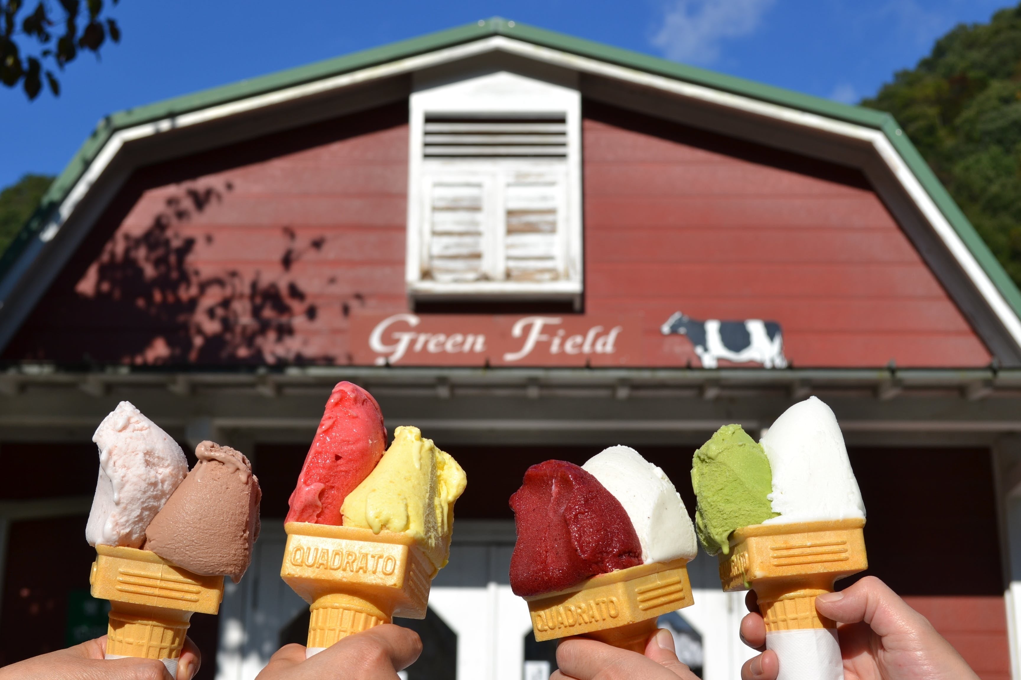 搾りたての牛乳と地元産の野菜や果物を使用したシンプルだけど味わい豊かなアイスクリームを提供しています。定番のバニラ、抹茶などの他に、ふきのとう、ナツハゼ、栗、焼き芋、かりんなど中山間地ならではのちょっと風変わりなフレーバーをセットでお届けします。