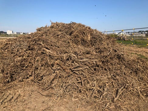 刈り取られた山積みの草。4tダンプ数台分になりました。