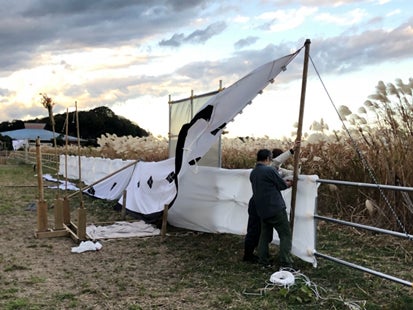 陣幕には風通し穴を開けてありますが、風の強さによっては、陣幕下部を固定せずに風に吹かれるままにします。