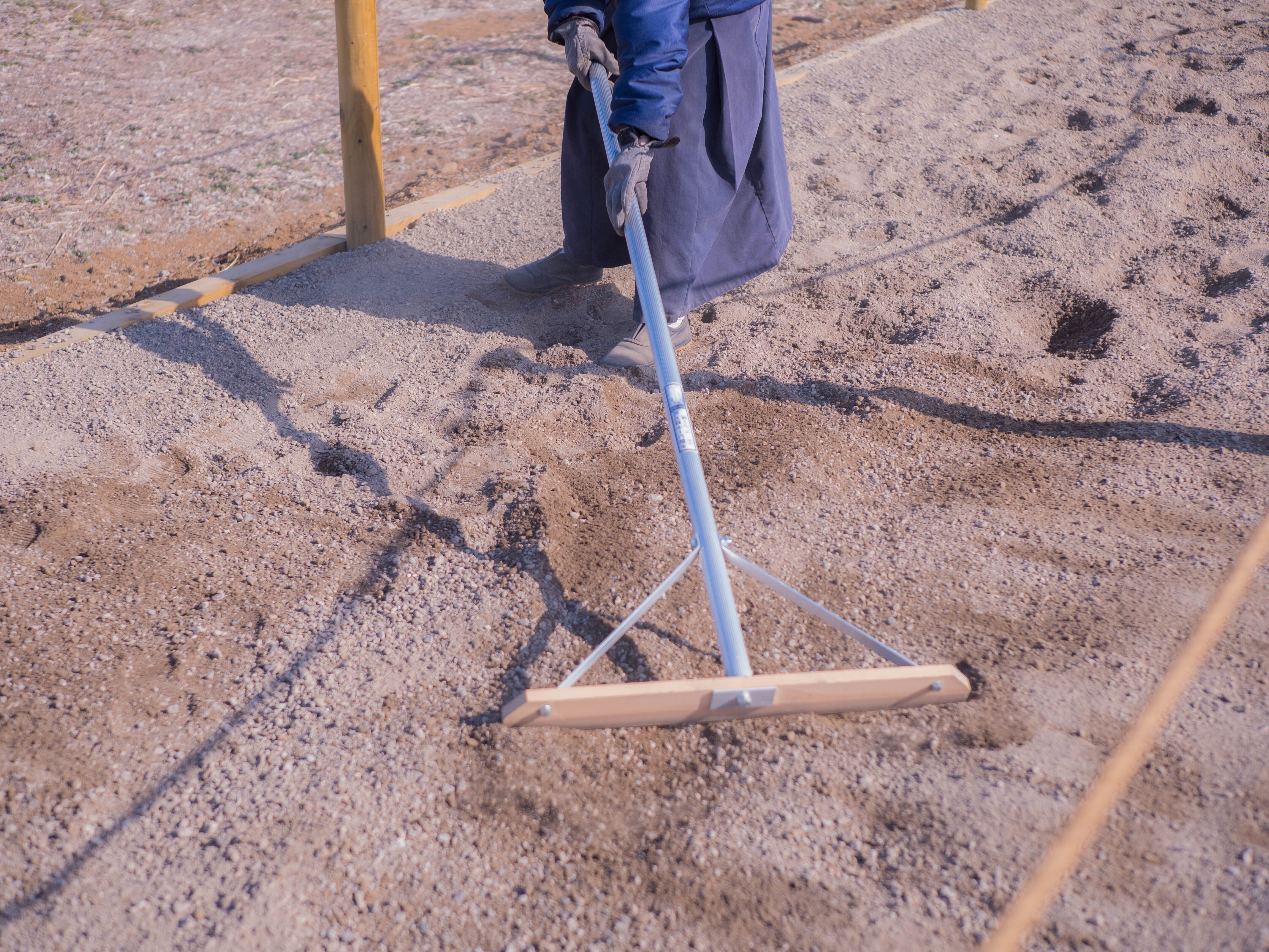 工事の際は、ダンプカーで積んできた砂を重機で均しましたが、細部は人力でした。