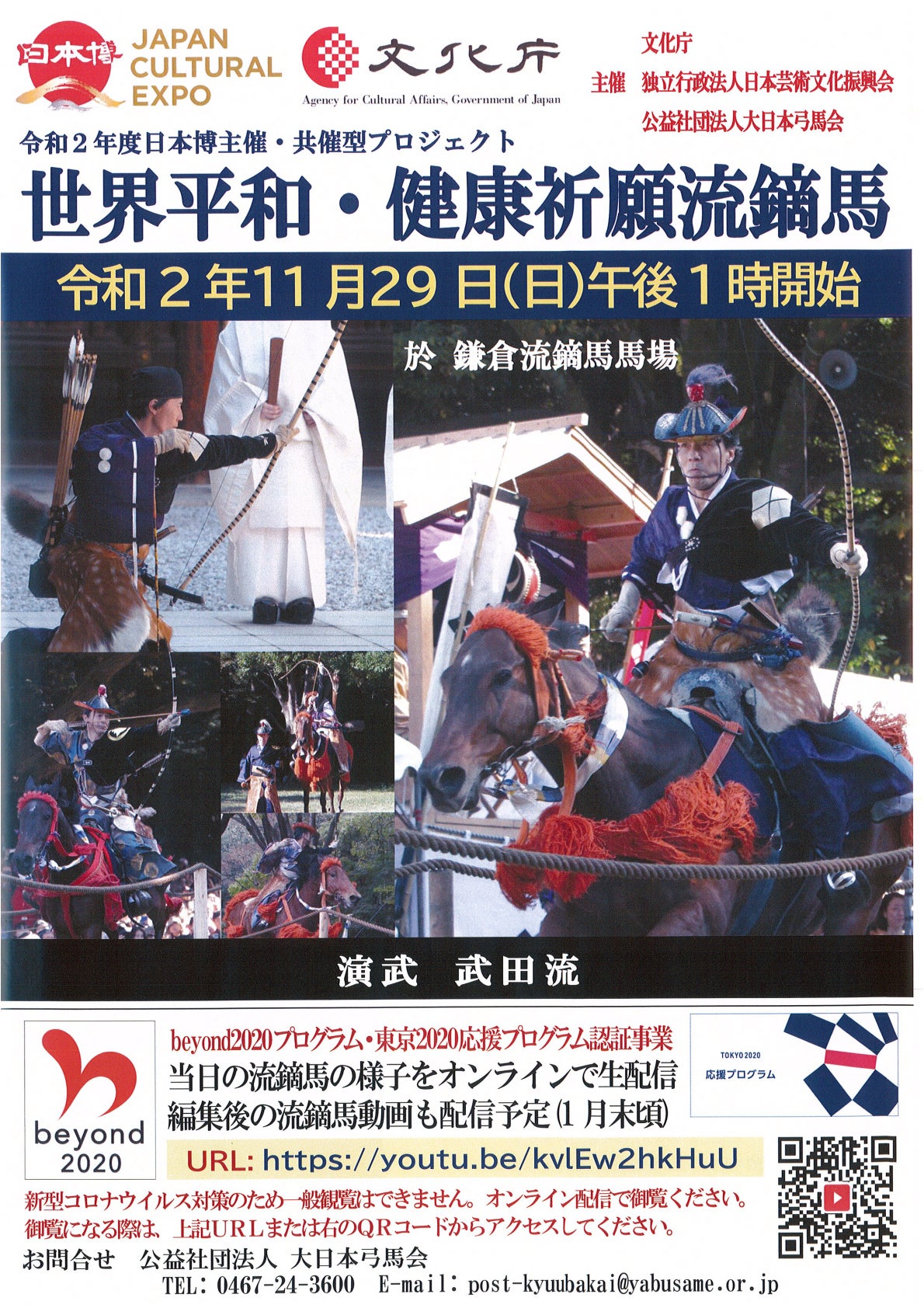 馬場が完成し、いよいよ本格稼働です。まず、こけら落としのイベントとして「世界平和・健康祈願流鏑馬」が開催されます。1 日時 令和2年11月29日(日)13:00~15:002 場所 鎌倉流鏑馬馬場 ←今回の新馬場場です3 主催 文化庁、独立行政法人日本芸術文化振興会、公益社団法人大日本弓馬会4 内容 天下泰平・五穀豊穣・万民息災とともに、新型コロナウイルスの早期収束と、来年度に延期された東京2020オリンピック・パラリンピック競技大会の安全な開催及び成功も併せて祈念して流鏑馬を行います。5 観覧 一般観覧不可ですが、コロナ対策を踏まえた新しい生活様式に対応した伝統文化の見せ方として、自宅でもオンラインで観覧できます。 <ライブ配信>大日本弓馬会YouTube 12:50~15:00 URL: https://youtu.be/kvlEw2hkHuU主催者に文化庁が含まれている国家プロジェクトとしての流鏑馬です。多くの方に新しい馬場の魅力と意義をお伝えすることができる絶好の機会です。ぜひ、ご覧ください。