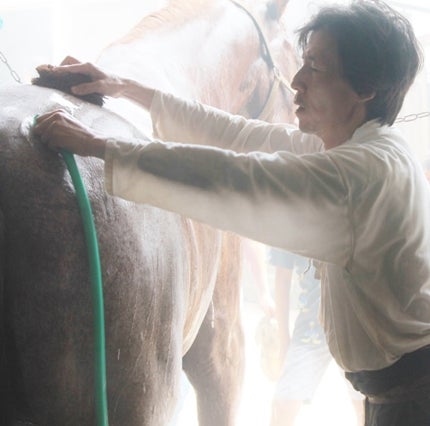 稽古の様子をお知らせします。写真は馬とコミュニケーションを取りながら馬装を確認しているところです。馬装は乗り手の命にも関わるため、念入りに確認する必要がありますが、馬具は馬にとって必ずしもありがたい物ではないため、同時に馬の様子を注意深く見ながら、人馬一体に向けて気を高めていきます。大日本弓馬会では、既に製造技術が絶えてしまった和式の馬具を修繕しながら使っています。馬具の装着方法も古式に基づいたものであり、覚えるのもひと苦労です。新馬場が完成したら、このような馬具にもご注目ください。新馬場では、流鏑馬講座や射手との交流を通じた流鏑馬の魅力を伝えるイベントも行う予定です。