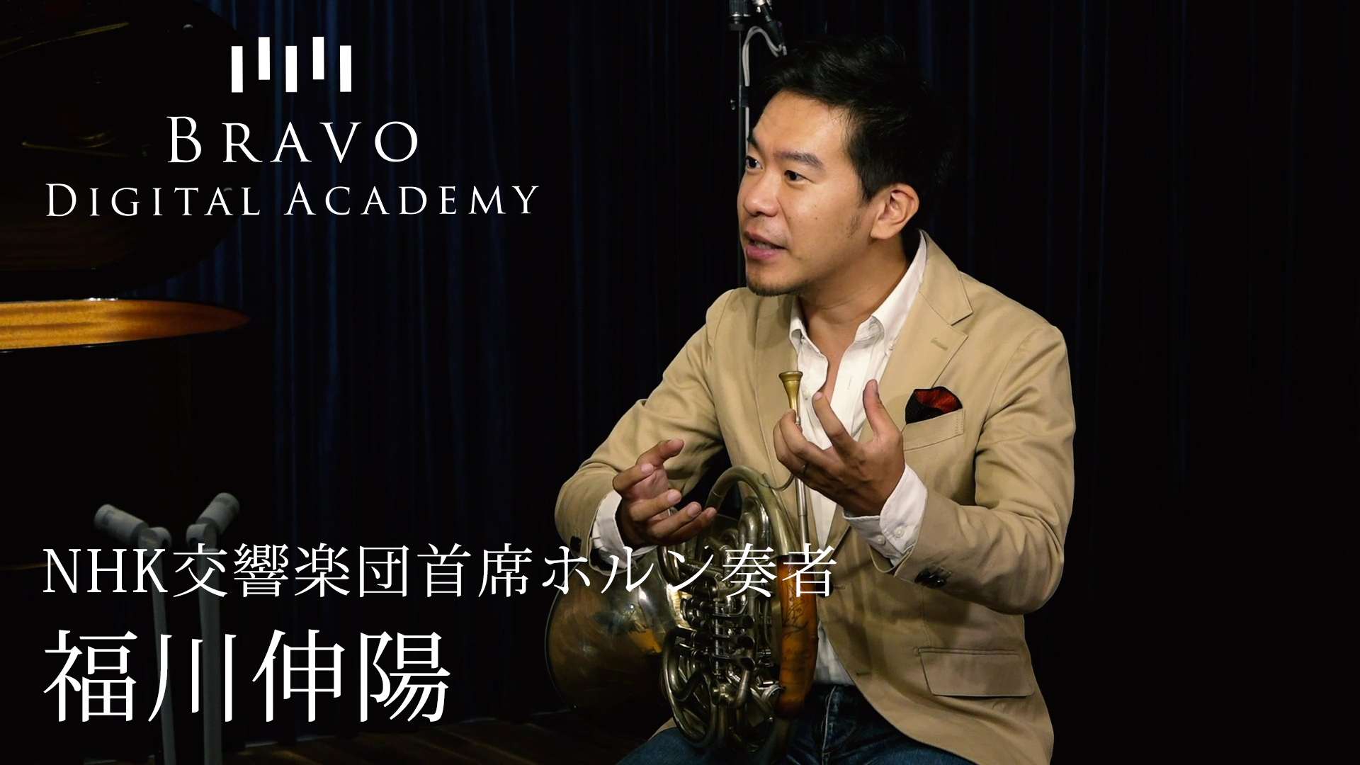 今回、講師を務めるのは、東京交響楽団コンサートマスターの水谷晃さん、SWRシュトゥットガルト放送交響楽団コントラバス奏者の幣隆太朗さん、NHK交響楽団首席ホルン奏者の福川伸陽さんという日本や世界の第一線で活躍するトップ・アーティストたちです。BRAVO DIGITAL ACADEMYマスタークラスを通して、彼ら自身の日頃の練習方法や音楽に対する考え方、アプローチ方法を共有するという、本来クローズドであるはずの世界に、日本中の子供たちが、地域を問わず自宅にいながらにして触れることができるのです。それは、まったく新しい音楽教育の姿と言えます。