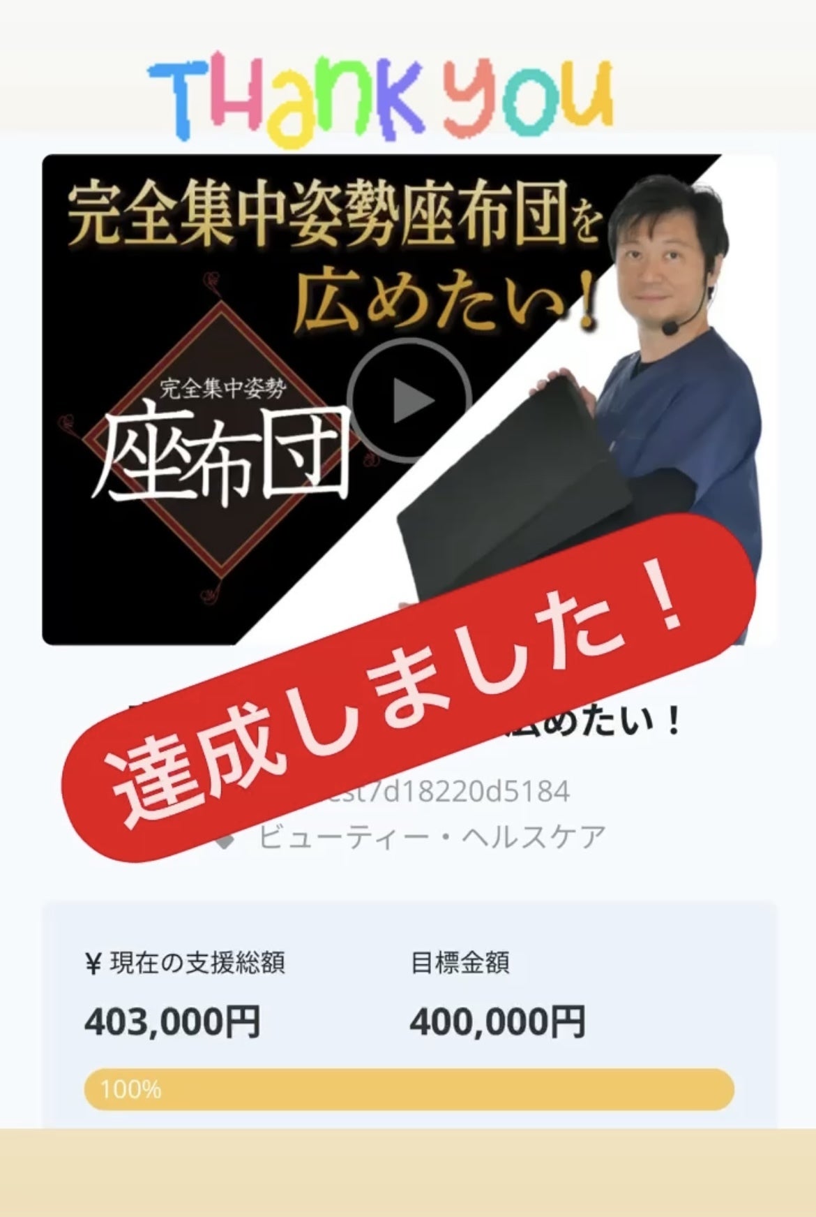 2020/12/25 20:33本当にご支援ありがとうございます本日11:47に達成率100%を超えましたこれもひとえに皆様のご支援によるものです本当にありがとうございます正直達成しなかったらどうしよう・・・と不安になることもありましたしかし、皆様の支援が日に日に達成に向けて高まっていく様子を見ていて「本当に感謝しかないなぁ」と噛み締めています残りわずかとなりましたが引き続き、仕事中に効率よく集中できる環境を届けるために完全集中姿勢座布団を広めていただければと思います本当にありがとうございます中村哲也 もっと見る治療家の先生に試していただきました