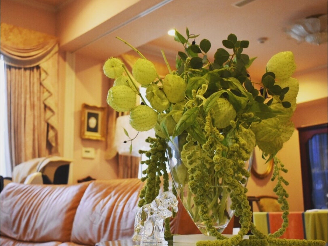 自宅リビング。こちらでレッスンさせて頂きます。ふわふわの実は、「フウセントウワタ」と言います。しばらく飾っていると実がはじけて、中からふわふわの綿のような種が出てきます。おもしろいですね。