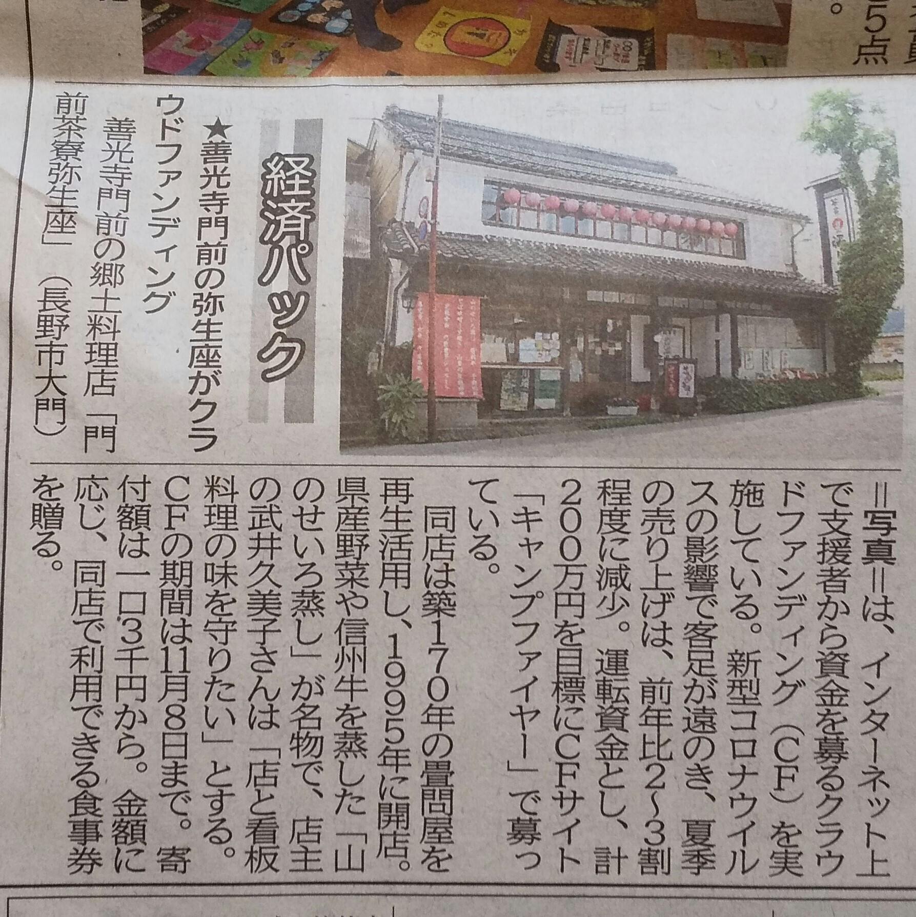 弥生座が名物料理の「山のせいろ蒸し」をコロナに負けないで存続させようとキャンウファイヤーにプロジェクトを立ち上げたことが、24日付の地元信濃毎日新聞に紹介されました(写真)。