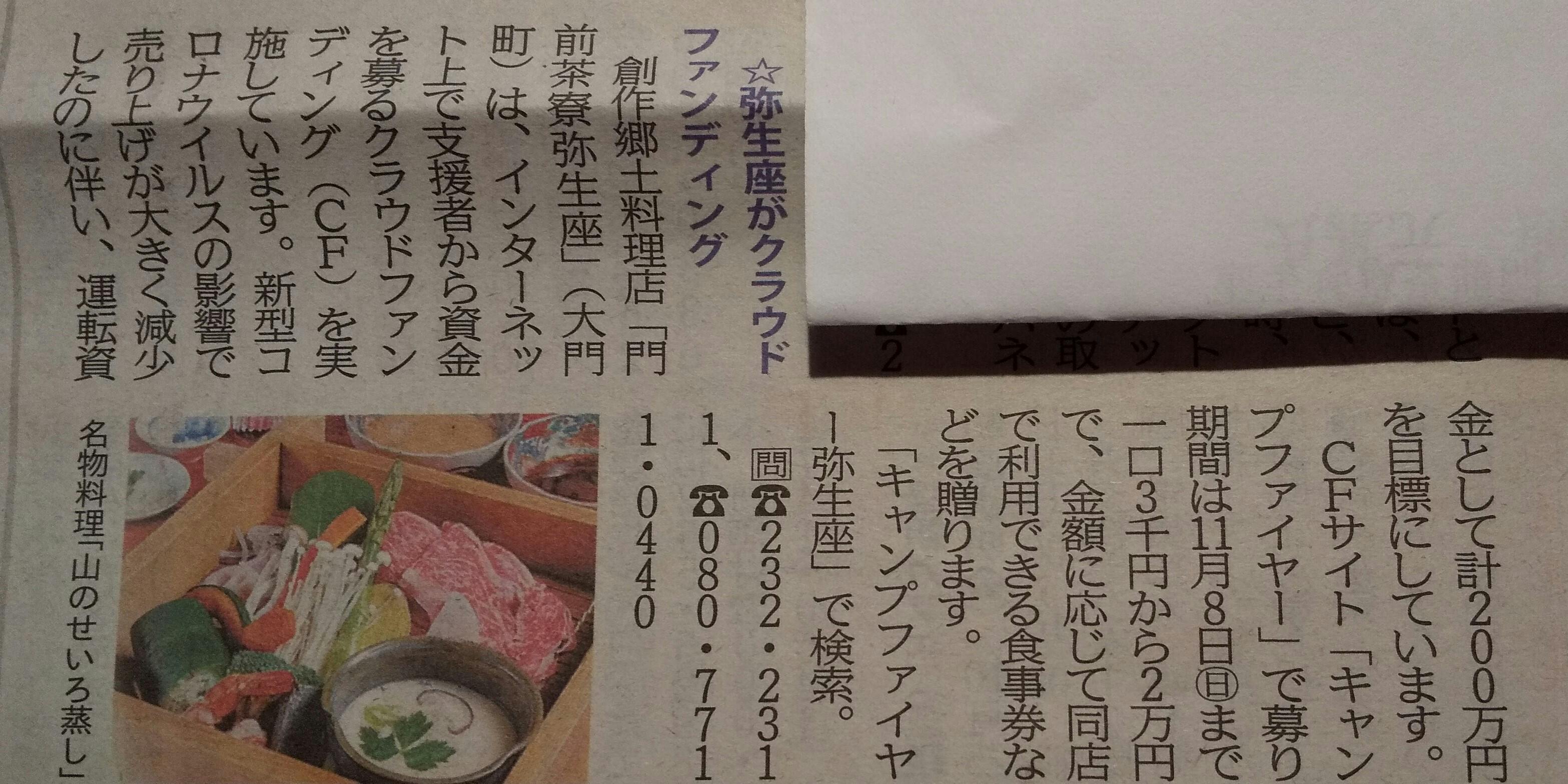 このプロジェクトも余すところ29日。皆様のご支援のおかげで予想以上の好成績ですが、目標にはもう一歩ですので、引き続きよろしくお願い申し上げます。本日、地元のタブロイド紙「週刊長野」にも掲載していただきました(写真)。弥生座と「山のせいろ蒸し」存続のために皆様のお力をどうかよろしくお願い申し上げます。皆様に頼っているだけではなく、店主である私自身に最終責任があると自覚して、店を廃業に追い込まぬようあらゆる策を講じて踏ん張っております。