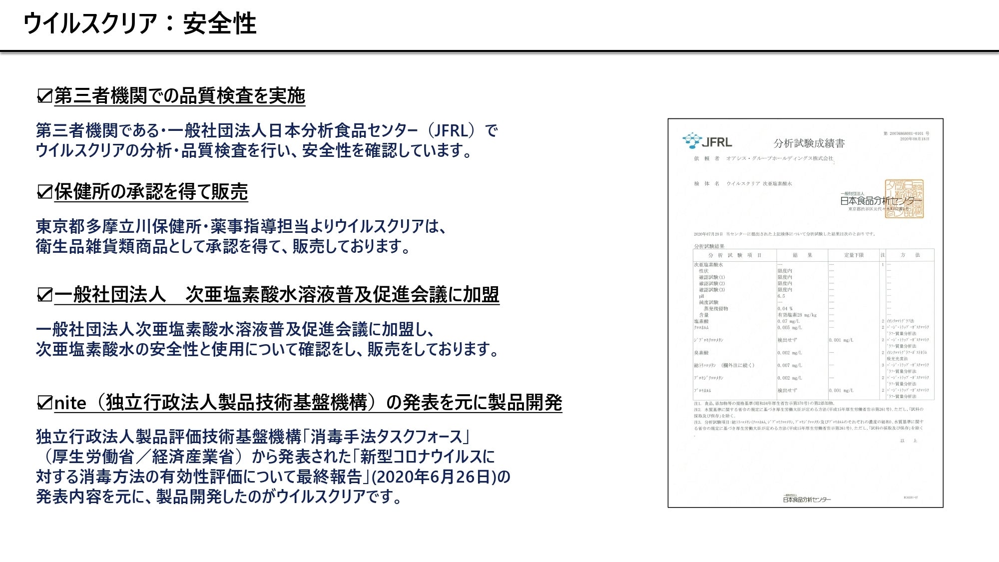 ウイルスクリアは第三者機関(日本食品分析センター)にてエビデンスを受けております!