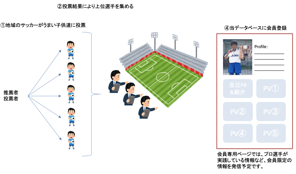 以下の4つのプロセスで、選手自身がプレー動画やプロフィールを公開し、サポーターが早いうちから若手選手(小中学生)のファンになって優秀な選手を見出せる環境を作ります。