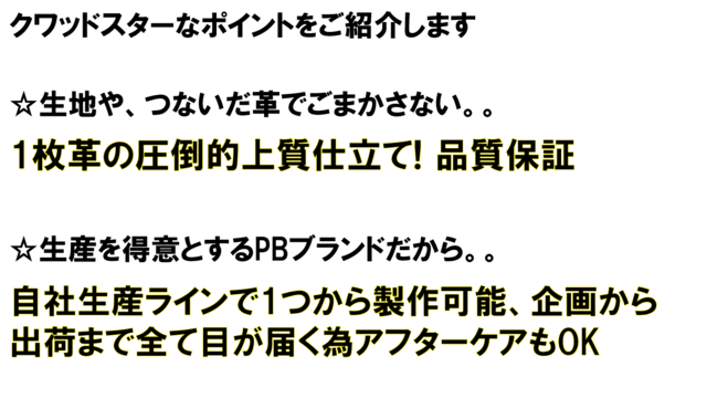 大阪を拠点に革製品のデザイン・生産を手掛ける、ブランド展開する方々からすれば【革製品のプロダクトを提供するプロ】他社様ブランドやコラボレーションを多くプロダクトして参りましたが、2017年より【時が経っても色褪せないスタンダード】をテーマにシンプルで必要な機能だけを残したミニマルなデザインが特徴である【クワッドスター】を多方面で展開する。