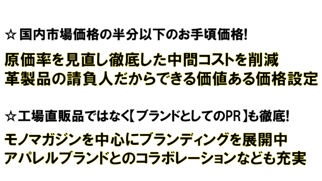 定価が安く見えるとそれなりの商品に感じますが【少し見る角度を変えてみる事が大切な時代になりました】原価率を抑える努力・無駄な中間コストをカットする努力により【真実の価格】で1点から製作するというスタイルで貫く。3つの雫の形があってこそ希少価値ある製品をお届けできる最善の方法と考えてございます。クワッドスターの理念として革素材には植物タンニン鞣しの革をふんだんに使用し【1つの物を長く使い続ける事】により、経年変化を楽しみながらサステナブルな視点でプロダクトを行っています。大量生産・消費にとらわれず【10営業日】のスピードで1点から自社生産ラインだけで【目の届く生産】をポリシーとしてございます。ブランドネームのクワッドスター=4つ星は3以上5未満、いつまでも現状におごらず上を目指す心を忘れない。。信念を持ち続けブランディングを進めて参ります、プロジェクトご覧頂きまして誠にありがとうございました。