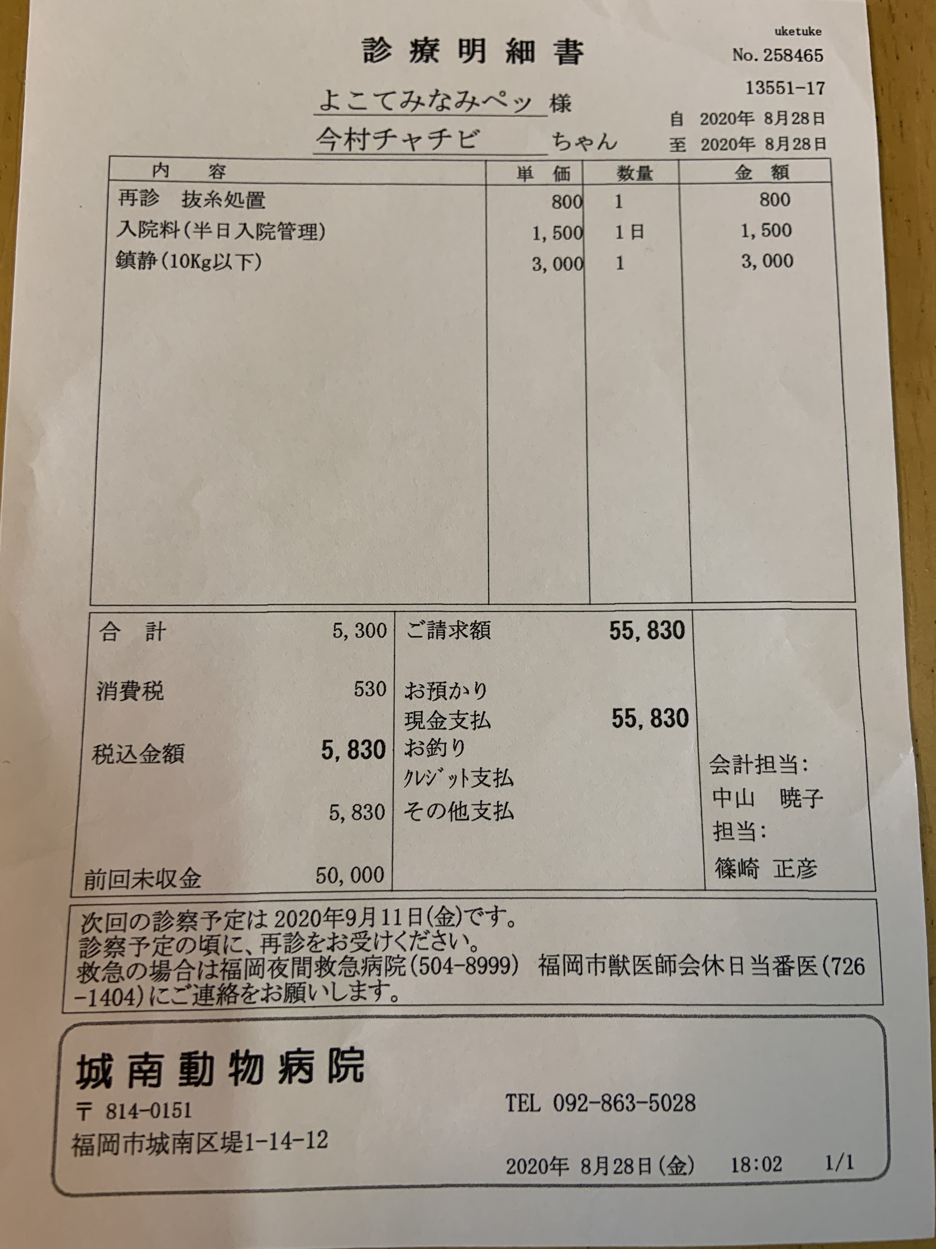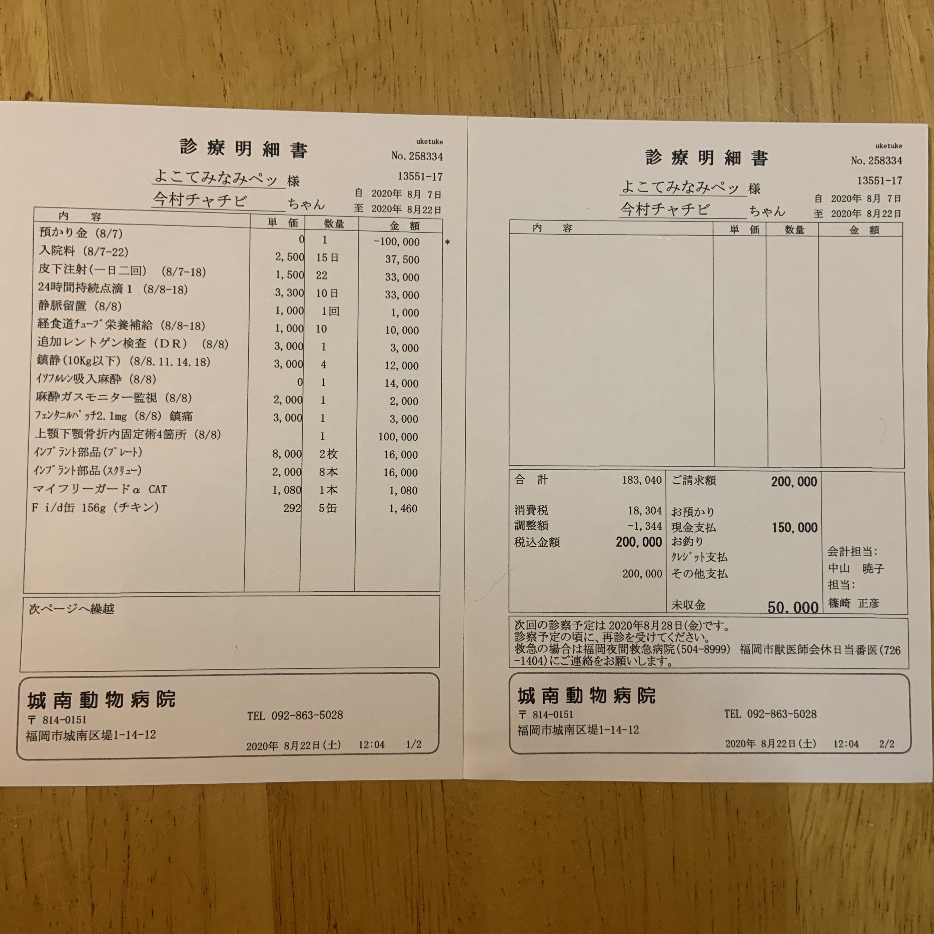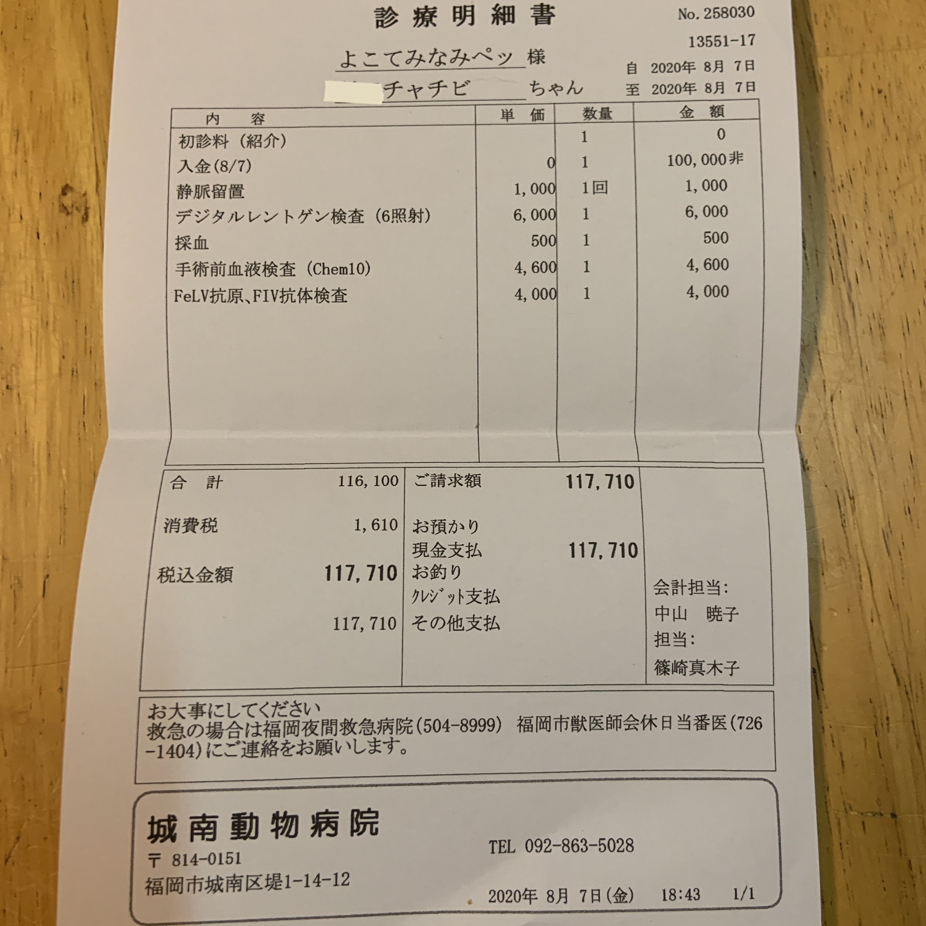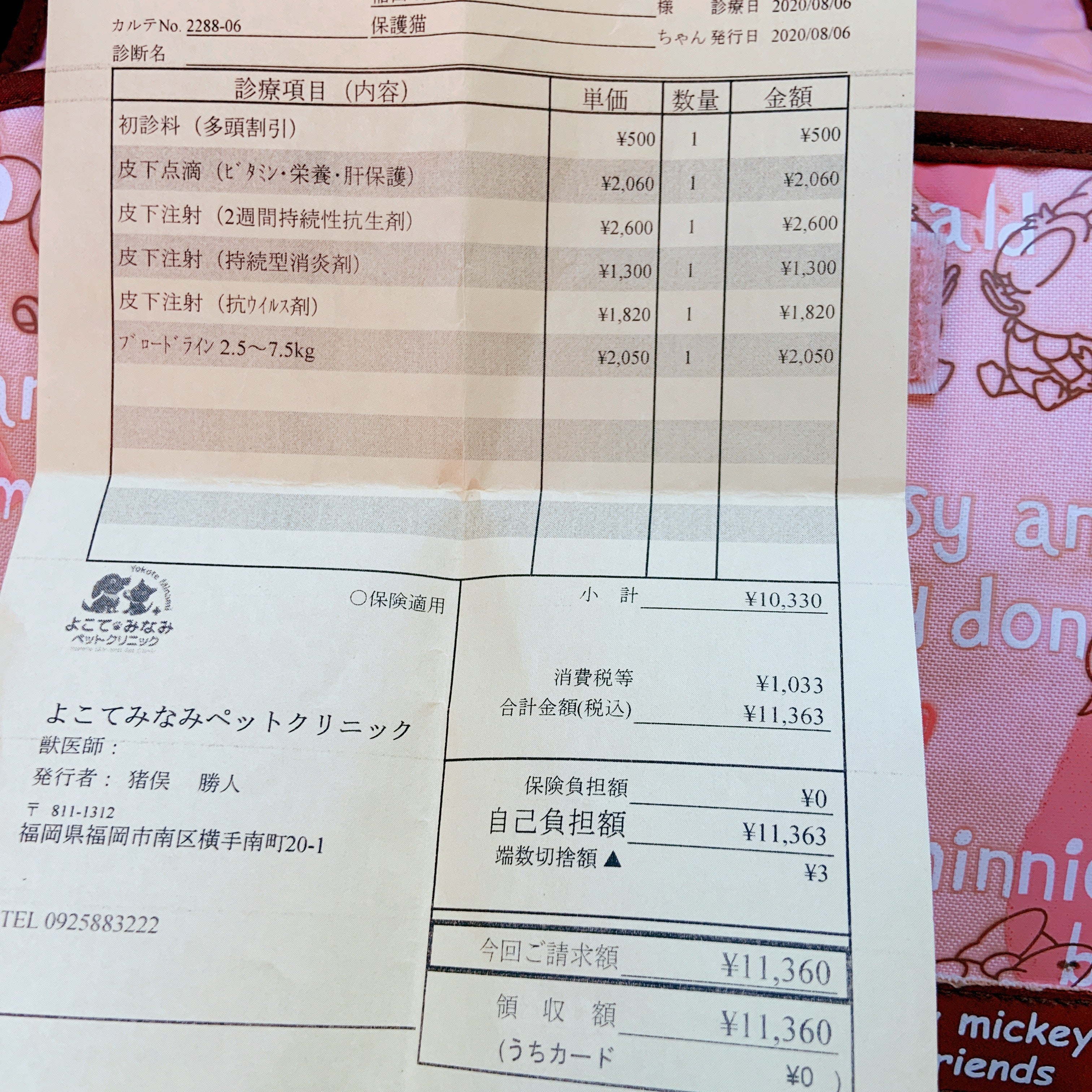 【今までにかかりました、動物病院での領収書、明細書になります。】